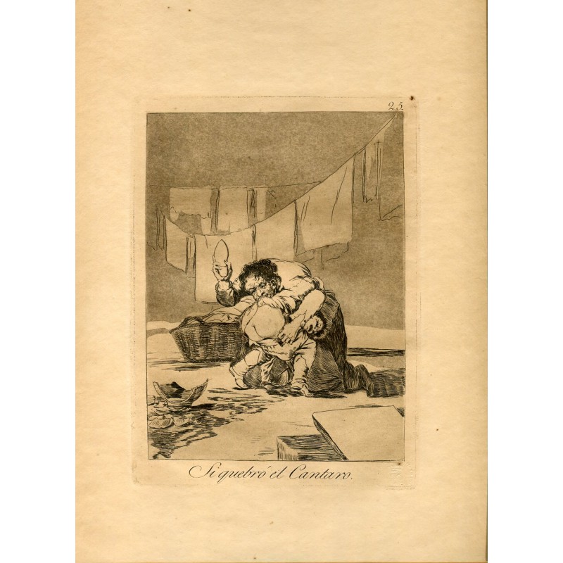 'Si quebró el cantaro' (Plate 25 Los Caprichos). Print related to Capricho 3 (Que viene el Coco). Goya addresses the pernicious system of educating children through violence. The label of the print contains the ironic intention of the author, highlighting the absurdity of the punishment and the fury of the mother in view of the insignificance of the child's fault. Goya emphasizes the violence of the mother's face and the terror of the child's countenance, evidencing the disproportion between punishment and fault. On the other hand, authors such as J. Adhémar or P. Lefort, believe that this picture refers to the violent disputes that took place between Queen María Luisa and the infant, later Fernando VII, during the last years of the reign of Carlos IV , all this due to the violent aversion that the infant felt for Godoy.