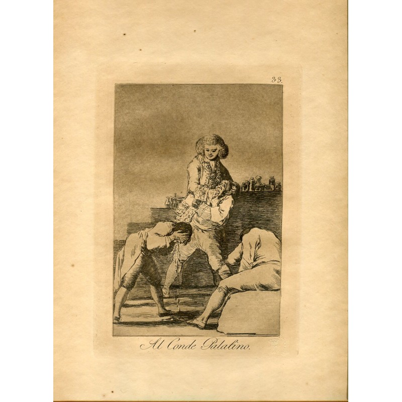 El presente grabado tiene el número 19 en el reverso. El grabado tiene un sello en relieve con las iniciales 'CN' rodeadas de un borde que dice: Calcografia Nacional Ministerio de Instrucción Pública. Se dedicaron cinco juegos, numerados del 1 al 5, a Stalin, Sra. Eleanor Rooselvet, y al presidente republicano Azaña, presidente de la República, quedando dos juegos sin contabilizar. También se emitieron quince series numeradas del 6 al 20, en papel del Japón imperial. Al parecer, poco a partir de obra del estallido de la Guerra Civil Española, todas las planchas de cobre de Goya iban a ser enviadas a París con vistas a imprimir allí una edición. El trabajo fue finalmente emprendido en la Calcografía. Una de las primeras series emitidas en 1937 fue donada por la Embajada de España en Londres al Victorian and Albert Museum, donde estuvo expuesta. Thomas Harris afirma que esta edición está muy bien impresa. Estado: En buen estado. Tiene pequeños puntos de óxido (aprox. 10 puntos) que no afectan a la imagen como se puede apreciar en las fotos. 'Al Conde Palatino' (Lámina 33 Los Caprichos). Esta grabado tiene como punto de partida el dibujo del Álbum B, 68. En la parte superior del dibujo hay una inscripción en italiano que significa Toda palabra es mentira, que junto a esta anotación y el cúmulo de detalles circunstanciales nos invitan creer que Goya tenía en mente un contenido satírico muy preciso cuando hizo el dibujo y lo tituló. La escena está compuesta por la representación de un hombre charlatán, que procede a extraer las muelas sin dolor; junto a él, un paciente espera su turno. Otro, ya operado, parece sufrir violentamente. Según una antigua tradición, este grabado tendría una alusión política relacionada con la identificación del charlatán con el ministro Urquijo, cuyo sistema de gobierno se basaba en la violencia y la represión. Los Caprichos son ante todo una sátira concebida como un medio para combatir los vicios de los hombres y los absurdos del comportamiento humano. Simplificando la serie, podemos agrupar las grabados en torno a cuatro grandes temas, todos ellos sin duda de tono crítico. En el primero de ellos, aborda el engaño en las relaciones entre hombre y mujer: el cortejo como práctica común según la cual el hombre moderno, ocupado en sus diversos negocios, permitía que su mujer fuera acompañada en sus salidas por un galán; prostitución que denigraba y explotaba la condición de ambos sexos; y los matrimonios desiguales o matrimonios de conveniencia, práctica habitual en su época y criticada por los ilustrados. La sátira de la mala educación y la ignorancia, fruto de la preocupación ilustrada por este tema, se refleja en los Caprichos que muestran las consecuencias de las malas enseñanzas en los niños; falsas creencias y supersticiones producidas por la ignorancia; y la brujería como manifestación suprema de la falta de educación y la superstición. La condena de los vicios arraigados en la sociedad, y particularmente en el clero, también tienen cabida: la vanidad, la gula, la pereza, la lujuria o la codicia se nos muestran de forma cáustica en otro grupo de grabados. Finalmente, otros Caprichos revelan su protesta contra los abusos de poder: la Inquisición, la arrogancia de las clases dominantes, la explotación del pueblo y las injusticias de la ley.Puede encontrar más artículos en nuestra tienda en el sitio://https: //www.rubylane.com/item/2211649