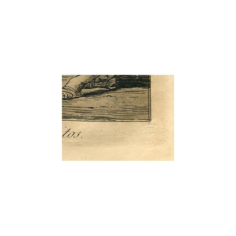 El presente grabado tiene el número 19 en el reverso. El grabado tiene un sello en relieve con las iniciales 'CN' rodeadas de un borde que dice: Calcografia Nacional Ministerio de Instrucción Pública. Se dedicaron cinco juegos, numerados del 1 al 5, a Stalin, Sra. Eleanor Rooselvet, y al presidente republicano Azaña, presidente de la República, quedando dos juegos sin contabilizar. También se emitieron quince series numeradas del 6 al 20, en papel del Japón imperial. Al parecer, poco a partir de obra del estallido de la Guerra Civil Española, todas las planchas de cobre de Goya iban a ser enviadas a París con vistas a imprimir allí una edición. El trabajo fue finalmente emprendido en la Calcografía. Una de las primeras series emitidas en 1937 fue donada por la Embajada de España en Londres al Victorian and Albert Museum, donde estuvo expuesta. Thomas Harris afirma que esta edición está muy bien impresa. Estado: En buen estado. Tiene pequeñas manchas de óxido, 1-2 de ellas afectan la imagen como se puede apreciar en las fotos. 'Duendecitos' (Lámina 49 de Los Caprichos). En este grabado Goya retoma así su habitual doble ataque contra la aristocracia y el clero. En la escena se reconocen dos frailes, uno con sandalias y otro descalzo, y un sacerdote, de manos grandes y dientes afilados, con su cofia cuadrada y zapatos con hebillas. Las acepciones de duende y monje, sacerdote o fraile eran sinónimos en el siglo XVIII a nivel popular, mientras que la expresión "uñas largas" o "manos largas" equivalía a ladrón, de lo que puede inferirse una clara crítica a la Iglesia por su actitud depredadora. Los Caprichos son ante todo una sátira concebida como un medio para combatir los vicios de los hombres y los absurdos del comportamiento humano. Simplificando la serie, podemos agrupar las grabados en torno a cuatro grandes temas, todos ellos sin duda de tono crítico. En el primero de ellos, aborda el engaño en las relaciones entre hombre y mujer: el cortejo como práctica común según la cual el hombre moderno, ocupado en sus diversos negocios, permitía que su mujer fuera acompañada en sus salidas por un galán; prostitución que denigraba y explotaba la condición de ambos sexos; y los matrimonios desiguales o matrimonios de conveniencia, práctica habitual en su época y criticada por los ilustrados. La sátira de la mala educación y la ignorancia, fruto de la preocupación ilustrada por este tema, se refleja en los Caprichos que muestran las consecuencias de las malas enseñanzas en los niños; falsas creencias y supersticiones producidas por la ignorancia; y la brujería como manifestación suprema de la falta de educación y la superstición. La condena de los vicios arraigados en la sociedad, y particularmente en el clero, también tienen cabida: la vanidad, la gula, la pereza, la lujuria o la codicia se nos muestran de forma cáustica en otro grupo de grabados. Finalmente, otros Caprichos revelan su protesta contra los abusos de poder: la Inquisición, la arrogancia de las clases dominantes, la explotación del pueblo y las injusticias de la ley.Puede encontrar más artículos en nuestra tienda en el sitio://https: //www.rubylane.com/item/2211649