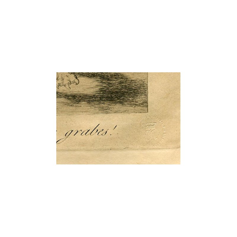 El presente grabado tiene el número 19 en el reverso. El grabado tiene un sello en relieve con las iniciales 'CN' rodeadas de un borde que dice: Calcografia Nacional Ministerio de Instrucción Pública. Se dedicaron cinco juegos, numerados del 1 al 5, a Stalin, Sra. Eleanor Rooselvet, y al presidente republicano Azaña, presidente de la República, quedando dos juegos sin contabilizar. También se emitieron quince series numeradas del 6 al 20, en papel del Japón imperial. Al parecer, poco a partir de obra del estallido de la Guerra Civil Española, todas las planchas de cobre de Goya iban a ser enviadas a París con vistas a imprimir allí una edición. El trabajo fue finalmente emprendido en la Calcografía. Una de las primeras series emitidas en 1937 fue donada por la Embajada de España en Londres al Victorian and Albert Museum, donde estuvo expuesta. Thomas Harris afirma que esta edición está muy bien impresa. Estado: En buen estado. Tiene pequeñas manchas de óxido que no afectan a la imagen como se puede apreciar en las fotos. ¡Miren que grabes! (Lámina 63 de Los Caprichos). Este sello corresponde al grupo temático del "poder de la ignorancia". Goya aborda este tema a través de la representación de dos personificaciones de la estupidez, con expresiones de enorme placidez, que están montadas sobre figuras con cabeza de burro, símbolo de la ignorancia de las personas que deben soportar las fantasías de estos dos monstruosos personajes. Los comentarios contemporáneos aluden al ambiente de la corte ya los abusos de autoridad promovidos por quienes la componen. Los Caprichos son ante todo una sátira concebida como un medio para combatir los vicios de los hombres y los absurdos del comportamiento humano. Simplificando la serie, podemos agrupar las grabados en torno a cuatro grandes temas, todos ellos sin duda de tono crítico. En el primero de ellos, aborda el engaño en las relaciones entre hombre y mujer: el cortejo como práctica común según la cual el hombre moderno, ocupado en sus diversos negocios, permitía que su mujer fuera acompañada en sus salidas por un galán; prostitución que denigraba y explotaba la condición de ambos sexos; y los matrimonios desiguales o matrimonios de conveniencia, práctica habitual en su época y criticada por los ilustrados. La sátira de la mala educación y la ignorancia, fruto de la preocupación ilustrada por este tema, se refleja en los Caprichos que muestran las consecuencias de las malas enseñanzas en los niños; falsas creencias y supersticiones producidas por la ignorancia; y la brujería como manifestación suprema de la falta de educación y la superstición. La condena de los vicios arraigados en la sociedad, y particularmente en el clero, también tienen cabida: la vanidad, la gula, la pereza, la lujuria o la codicia se nos muestran de forma cáustica en otro grupo de grabados. Finalmente, otros Caprichos revelan su protesta contra los abusos de poder: la Inquisición, la arrogancia de las clases dominantes, la explotación del pueblo y las injusticias de la ley.Puede encontrar más artículos en nuestra tienda en el sitio://https: //www.rubylane.com/item/2211649