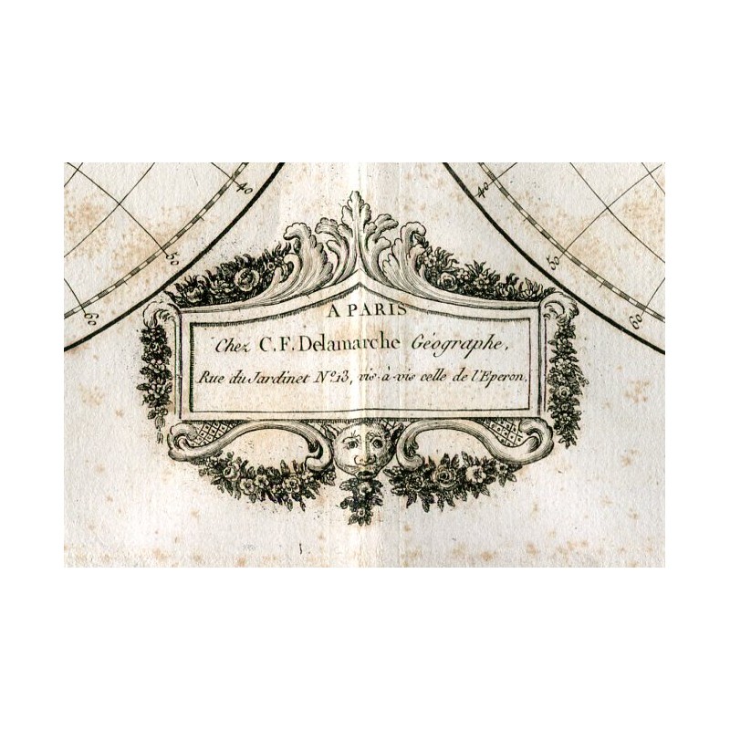 Mapa por Robert Vaugondy corregido y aumentado de nuevos descubrimientos por C.F. Delamarche sucesor de Vaugondy. Giles y Didier Robert de Vaugondy, padre e hijo, fueron famosos cartógrafos del siglo XVIII, descendientes del también cartógrafo Nicolas Sanson del que heredaron gran parte de su material cartográfico. En 1760 Didier Robert de Vaugondy fue nombrado geógrafo de Luis XV. En 1757 publicaron su más famosa obra Atlas Universal. Medias huella: 27,3x44,4 cms. y medidas hoja 31,8x45 cms. Manchas de oxido debido a la época que se aprecia en la fotografia.