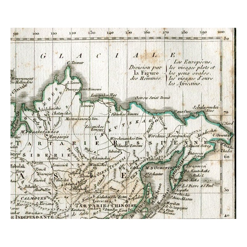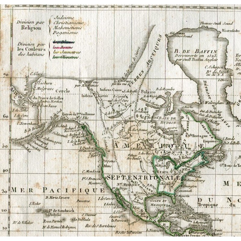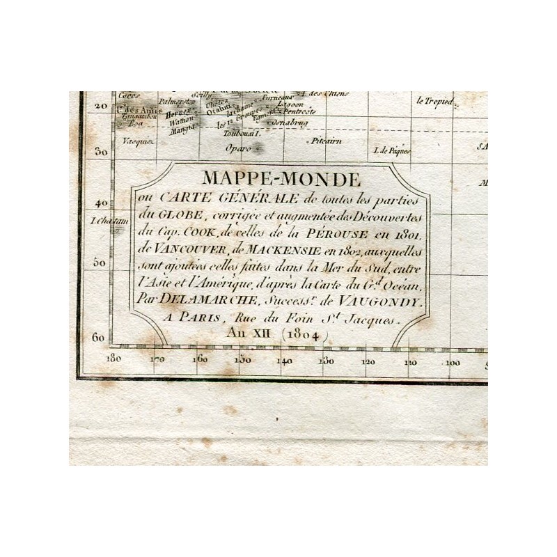 La impresión de la plancha de cobre muestra el hallazgo de las exploraciones de Cook, Perouse, Vancouver y Mackensie en 1801 y 1802. Las líneas costeras de América del Norte y las islas del Pacífico son razonablemente precisas. "Terres Arctiques" no está bien definido. Este es un mapa antiguo muy interesante. Coloreado a mano en el contorno y un solo pliegue tal como se emitió. .Recipiente :