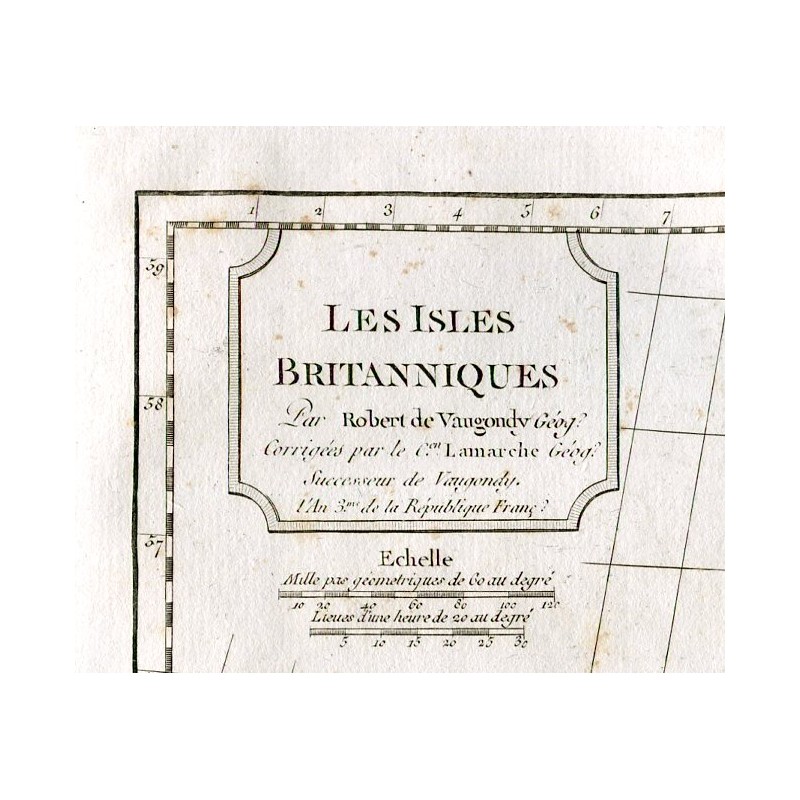 Mapa antiguo de Reino Unido. Un mapa creado por Robert de Vaugondy para el 'Atlas Universel' en 1757 y corregido por su sucesor Lamarche. El Atlas Universel es uno de los atlas más importantes del siglo XVIII. Se publicó poco después de la Revolución Francesa y se fechó en el año 3 del calendario republicano francés. Tamaño de la plancha: 27,3x44,4 cm. Tamaño del papel: 31,8x45 cm.