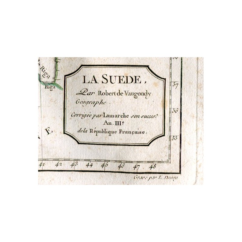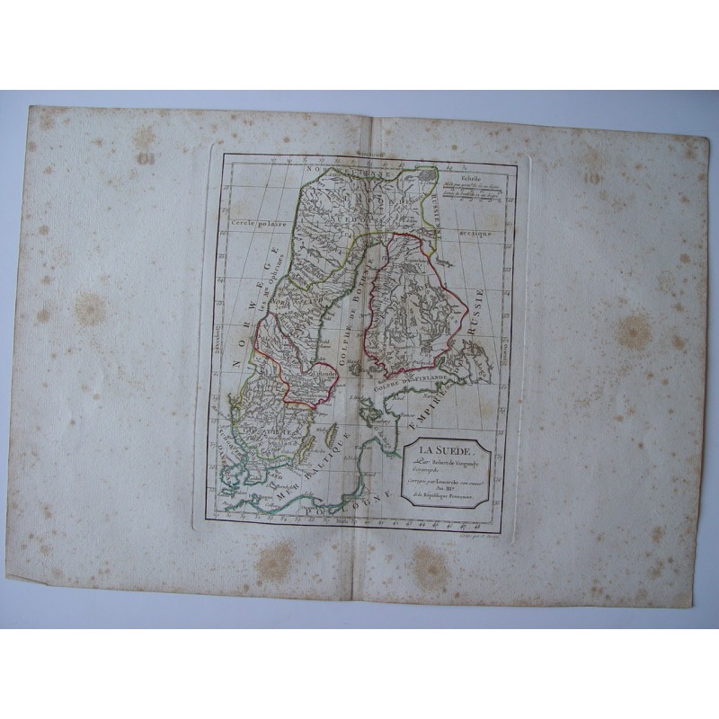 Mapa antiguo de Suecia (La Suede). Un mapa interesante creado por Robert de Vaugondy para el 'Atlas Universel' en 1757 y corregido por su sucesor Lamarche. El Atlas Universel es uno de los atlas más importantes del siglo XVIII. Se publicó poco después de la Revolución Francesa y se fechó en el año 3 del calendario republicano francés. Tamañoplancha: 26,8x44,1 cm. Tamaño papel: 31,8x45 cm.