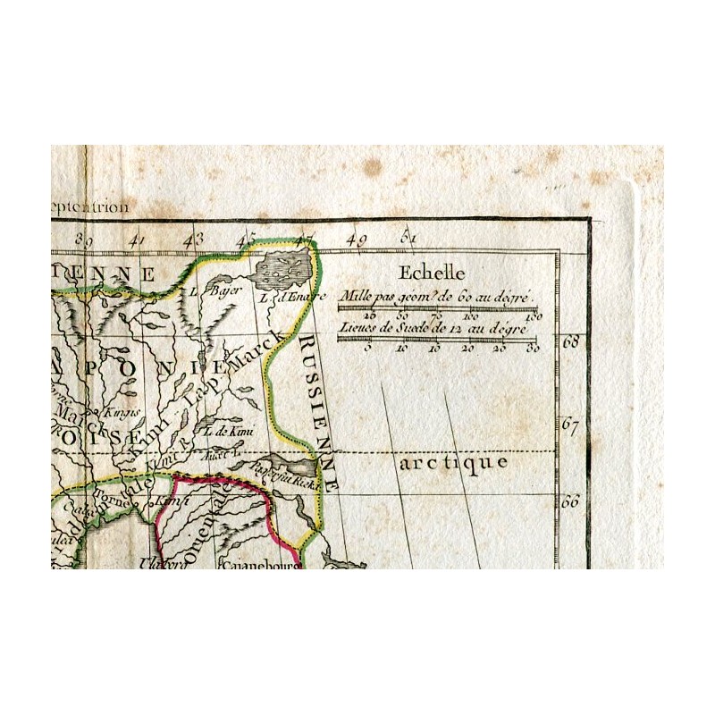 Estado: Manchas de óxido que se aprecian en la imagen. Gilles Robert de Vaugondy (1688-1766) y su hijo, Didier Robert de Vaugondy (1723-1786), formaron uno de los talleres de fabricación de mapas y globos terráqueos más destacados y reconocidos de Francia a mediados del siglo XVIII. Eran descendientes de uno de los cartógrafos más importantes del siglo anterior, Nicolas Sanson a través de su nieto Pierre Moulard-Sanson, de quien en 1730 heredaron la mayor parte del material cartográfico que la dinastía Sanson había acumulado durante casi un siglo de trabajo, material que completaron con el adquirido de los descendientes de Hubert Jaillot. Con ellos formaron la base con la que iniciar su obra más ambiciosa y conocida, el Atlas Universel (1757), uno de los más bellos atlas producidos por la escuela francesa a mediados de siglo. Para ello, los Vaugondy, que contaban con una excelente formación geográfica, integraron la información obtenida de la revisión de los materiales heredados más antiguos con los mapas más actualizados del momento, incluyendo nuevos topónimos, las últimas investigaciones académicas, los diarios de los exploradores y misioneros contemporáneos. e incluso observación astronómica, a veces comprobando y corrigiendo la latitud y longitud de muchos mapas a partir de sus propias observaciones. Además, a diferencia de muchos cartógrafos de la época, se esforzaron en indicar las fuentes que utilizaron para elaborarlos, al igual que hicieron en su momento cartógrafos tan destacados como Ortelius o Mercator. Ambos trabajaron juntos y, en ocasiones, no es posible atribuir sus mapas al padre o al hijo, ya que muchas veces firmaban con el apellido, sin las iniciales, aunque en otros casos la autoría puede determinarse por la forma distintiva de cada uno. : el padre normalmente usa "M. Robert" y el hijo "Robert de Vaugondy". Ambos recibieron el título honorífico de Geographe ordinaire du Roy, el padre en 1730 y Didier en 1760. A la muerte del hijo, el taller cartográfico pasó a Jean Fortin monos, en 1778, y más tarde a Charles Francis Delamarche.