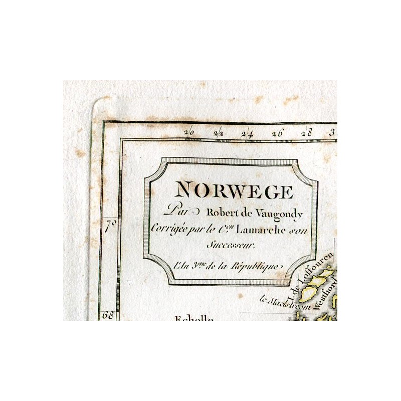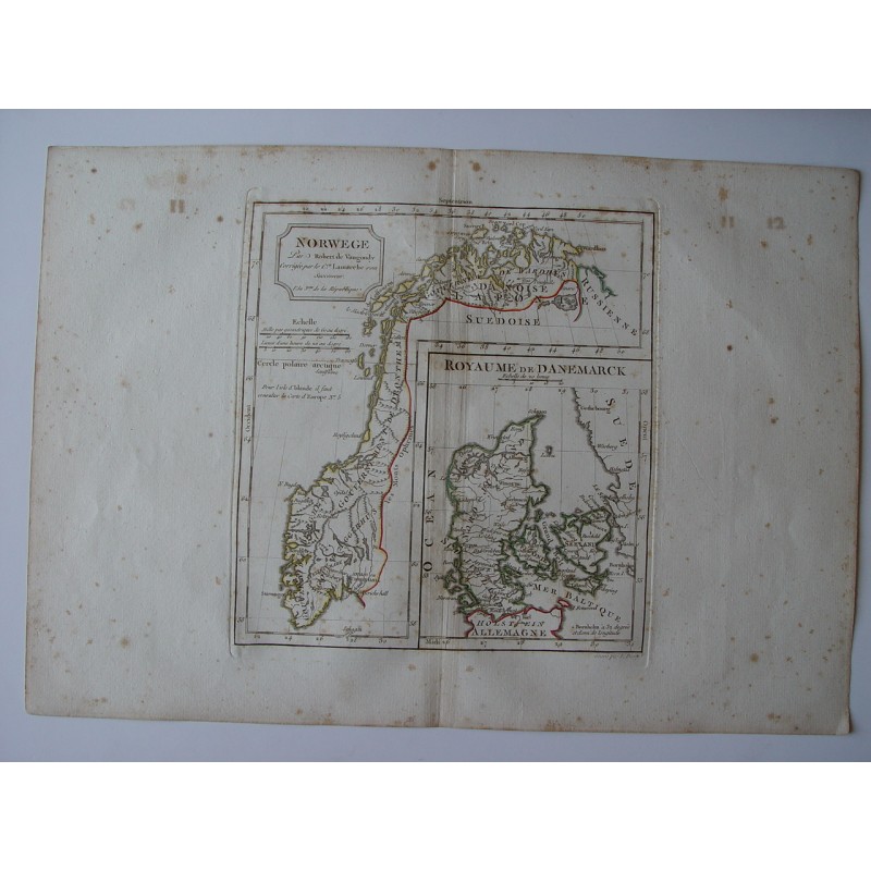 Mapa antiguo de Noruega y Dinamarca (Norwege el Royaume de Danemarck). Un mapa creado por Robert de Vaugondy para el 'Atlas Universel' en 1757 y corregido por su sucesor Lamarche. Fue publicado a partir de obra de la Revolución Francesa y fechado en el año 3 del Calendario Republicano Francés. Tamaño del plato: 25,4x30 cm. Tamaño del papel: 31,8x45 cm.