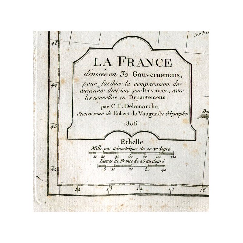 Mapa antiguo de Francia (La France). Roberto de Vaugondy (1806). Un mapa interesante creado por Robert de Vaugondy para el 'Atlas Universel' en 1757 y corregido por su sucesor Lamarche. El Atlas Universel es uno de los atlas más importantes del siglo XVIII. Esta impresión está fechada en 1806. Tamaño de la plancha: 25,3x23,8 cm. Tamaño del papel: 31,8x45 cm.