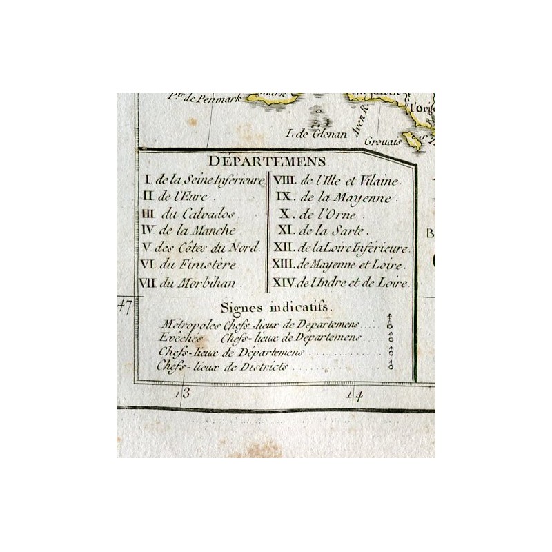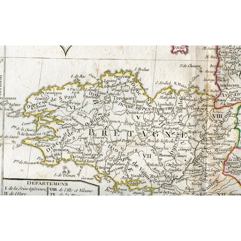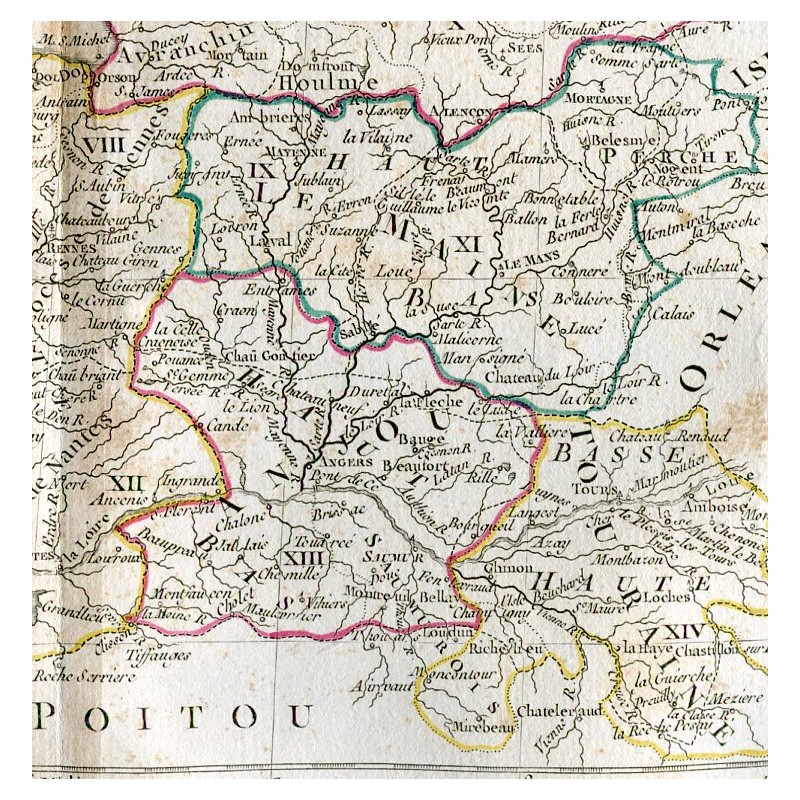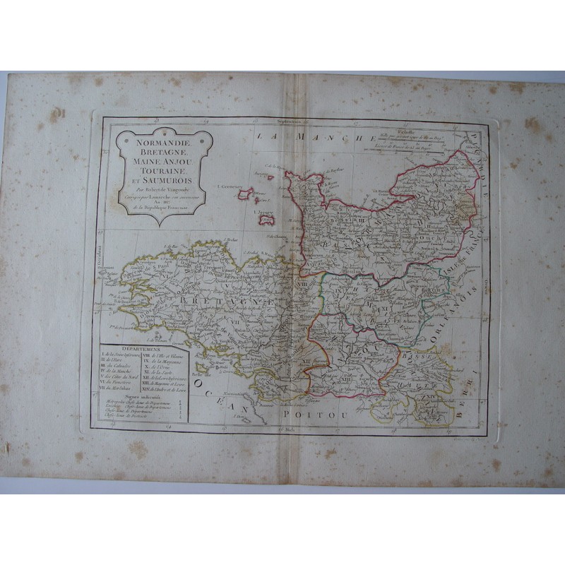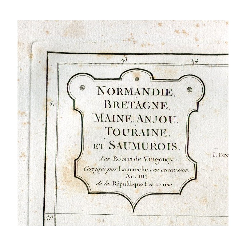 Las regiones de Normandie, Bretagne, Maine Anjou, Touraine et Saumurois están incluidas en el mapa de Robert de Vaugondy (1794). Estado: Manchas de óxido que se aprecian en la imagen. Gilles Robert de Vaugondy (1688-1766) y su hijo, Didier Robert de Vaugondy (1723-1786), formaron uno de los talleres de fabricación de mapas y globos terráqueos más destacados y reconocidos de Francia a mediados del siglo XVIII. Eran descendientes de uno de los cartógrafos más importantes del siglo anterior, Nicolas Sanson a través de su nieto Pierre Moulard-Sanson, de quien en 1730 heredaron la mayor parte del material cartográfico que la dinastía Sanson había acumulado durante casi un siglo de trabajo, material que completaron con el adquirido de los descendientes de Hubert Jaillot. Con ellos formaron la base con la que iniciar su obra más ambiciosa y conocida, el Atlas Universel (1757), uno de los más bellos atlas producidos por la escuela francesa a mediados de siglo. Para ello, los Vaugondy, que contaban con una excelente formación geográfica, integraron la información obtenida de la revisión de los materiales heredados más antiguos con los mapas más actualizados del momento, incluyendo nuevos topónimos, las últimas investigaciones académicas, los diarios de los exploradores y misioneros contemporáneos. e incluso observación astronómica, a veces comprobando y corrigiendo la latitud y longitud de muchos mapas a partir de sus propias observaciones. Además, a diferencia de muchos cartógrafos de la época, se esforzaron en indicar las fuentes que utilizaron para elaborarlos, al igual que hicieron en su momento cartógrafos tan destacados como Ortelius o Mercator. Ambos trabajaron juntos y, en ocasiones, no es posible atribuir sus mapas al padre o al hijo, ya que muchas veces firmaban con el apellido, sin las iniciales, aunque en otros casos la autoría puede determinarse por la forma distintiva de cada uno. : el padre normalmente usa "M. Robert" y el hijo "Robert de Vaugondy". Ambos recibieron el título honorífico de Geographe ordinaire du Roy, el padre en 1730 y Didier en 1760. A la muerte del hijo, el taller cartográfico pasó a Jean Fortin monos, en 1778, y más tarde a Charles Francis Delamarche.