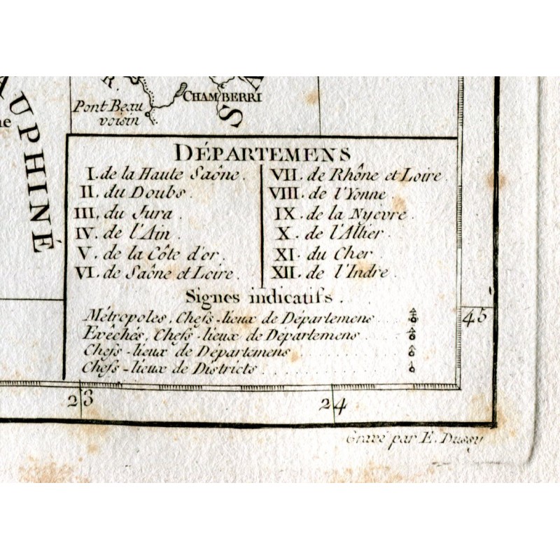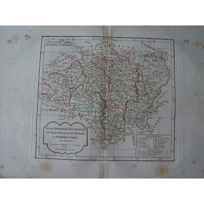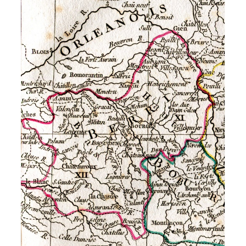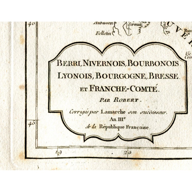 (Las regiones de Berri Nivernois, Bourbonois, Lyonois, Bourgogne están incluidas en el mapa de Robert de Vaugondy (1794) Estado: Manchas de óxido que se pueden ver en la imagen. Gilles Robert de Vaugondy (1688-1766) y su hijo, Didier Robert de Vaugondy (1723-1786), formaron uno de los talleres de elaboración de mapas y globos terráqueos más destacados y reconocidos de Francia a mediados del siglo XVIII. Eran descendientes de uno de los cartógrafos más importantes del siglo anterior, Nicolas Sanson a través de su nieto. Pierre Moulard-Sanson, de quien en 1730 heredaron la mayor parte del material cartográfico que la dinastía Sanson había acumulado a lo largo de casi un siglo de trabajo, material que completaron con el adquirido de los descendientes de Hubert Jaillot, con los que formaron la base con el que iniciar su obra más ambiciosa y conocida, el Atlas Universel (1757), uno de los más bellos atlas producidos por la escuela francesa a mediados de siglo, para ello, los Vaugondy, que habían sobresalido formación geográfica actual, integró la información obtenida de la revisión de los materiales heredados más antiguos con los mapas más actualizados del momento, incluyendo nuevos topónimos, las últimas investigaciones académicas, los diarios de exploradores y misioneros contemporáneos. e incluso observación astronómica, a veces comprobando y corrigiendo la latitud y longitud de muchos mapas a partir de sus propias observaciones. Además, a diferencia de muchos cartógrafos de la época, se esforzaron en indicar las fuentes que utilizaron para elaborarlos, al igual que hicieron en su momento cartógrafos tan destacados como Ortelius o Mercator. Ambos trabajaron juntos y, en ocasiones, no es posible atribuir sus mapas al padre o al hijo, ya que muchas veces firmaban con el apellido, sin las iniciales, aunque en otros casos la autoría puede determinarse por la forma distintiva de cada uno. : el padre normalmente usa "M. Robert" y el hijo "Robert de Vaugondy". Ambos recibieron el título honorífico de Geographe ordinaire du Roy, el padre en 1730 y Didier en 1760. A la muerte del hijo, el taller cartográfico pasó a Jean Fortin monos, en 1778, y más tarde a Charles Francis Delamarche.