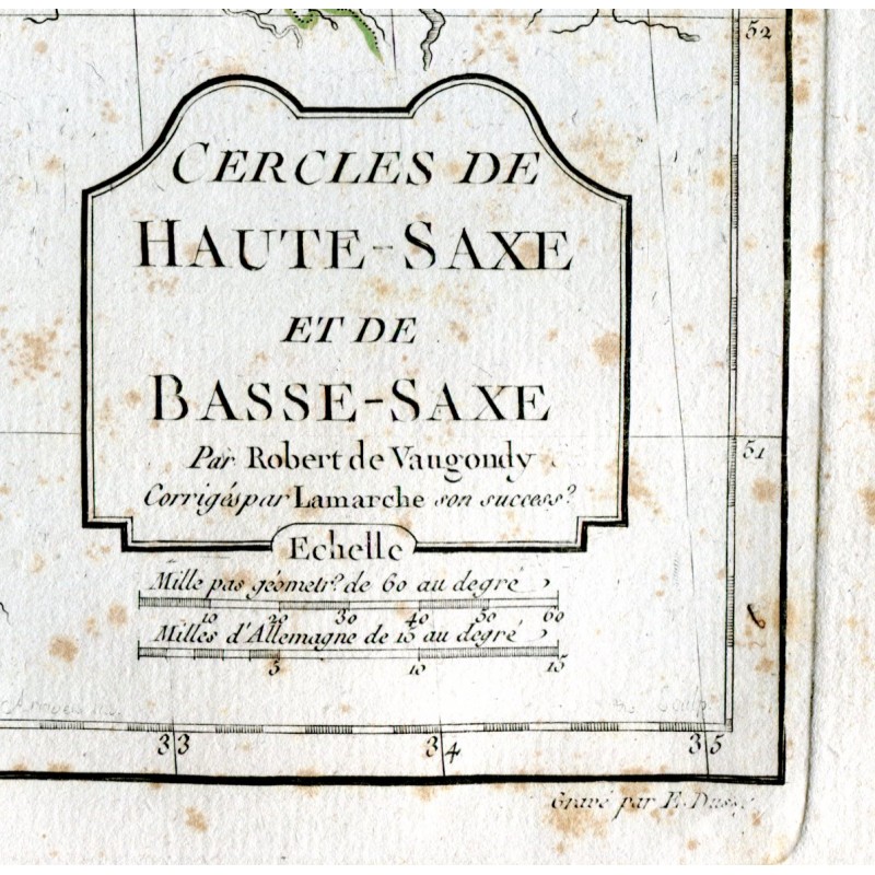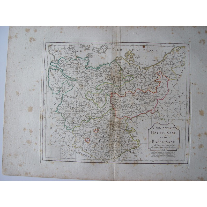 Mapa antiguo de las regiones del norte de Alemania (Cercles de Haute Saxe et de Basse-Saxe). Robert de Vaugondy.. Un interesante mapa creado por Robert de Vaugondy para el 'Atlas Universel' en 1757 y corregido por su sucesor Lamarche. El Atlas Universel es uno de los atlas más importantes del siglo XVIII. Tamaño plato: 25,6x32 cm. Tamaño del papel: 31,8x45 cm.