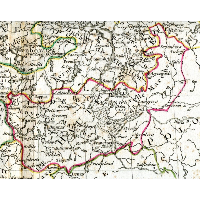 Estado: Manchas de óxido que se aprecian en la imagen. Gilles Robert de Vaugondy (1688-1766) y su hijo, Didier Robert de Vaugondy (1723-1786), formaron uno de los talleres de fabricación de mapas y globos terráqueos más destacados y reconocidos de Francia a mediados del siglo XVIII. Eran descendientes de uno de los cartógrafos más importantes del siglo anterior, Nicolas Sanson a través de su nieto Pierre Moulard-Sanson, de quien en 1730 heredaron la mayor parte del material cartográfico que la dinastía Sanson había acumulado durante casi un siglo de trabajo, material que completaron con el adquirido de los descendientes de Hubert Jaillot. Con ellos formaron la base con la que iniciar su obra más ambiciosa y conocida, el Atlas Universel (1757), uno de los más bellos atlas producidos por la escuela francesa a mediados de siglo. Para ello, los Vaugondy, que contaban con una excelente formación geográfica, integraron la información obtenida de la revisión de los materiales heredados más antiguos con los mapas más actualizados del momento, incluyendo nuevos topónimos, las últimas investigaciones académicas, los diarios de los exploradores y misioneros contemporáneos. e incluso observación astronómica, a veces comprobando y corrigiendo la latitud y longitud de muchos mapas a partir de sus propias observaciones. Además, a diferencia de muchos cartógrafos de la época, se esforzaron en indicar las fuentes que utilizaron para elaborarlos, al igual que hicieron en su momento cartógrafos tan destacados como Ortelius o Mercator. Ambos trabajaron juntos y, en ocasiones, no es posible atribuir sus mapas al padre o al hijo, ya que muchas veces firmaban con el apellido, sin las iniciales, aunque en otros casos la autoría puede determinarse por la forma distintiva de cada uno. : el padre normalmente usa "M. Robert" y el hijo "Robert de Vaugondy". Ambos recibieron el título honorífico de Geographe ordinaire du Roy, el padre en 1730 y Didier en 1760. A la muerte del hijo, el taller cartográfico pasó a Jean Fortin monos, en 1778, y más tarde a Charles Francis Delamarche.