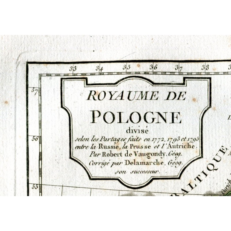 Mapa antiguo de Polonia (Royaume de Pologne). Robert de Vaugondy (1772, 1793, 1795). Un mapa interesante creado por Robert de Vaugondy para el 'Atlas Universel' en 1757 y corregido por su sucesor Lamarche. El Atlas Universel es uno de los atlas más importantes del siglo XVIII. Esta impresión está fechada en 1772, 1793 y 1795. Tamaño de la plancha: 25,2x29,5cm. Tamaño del papel: 31,8x45 cm.