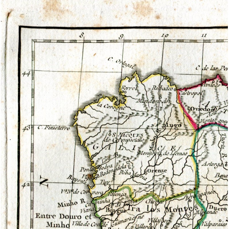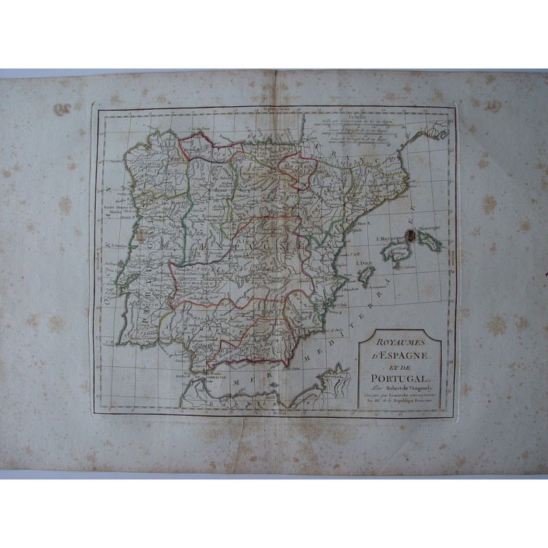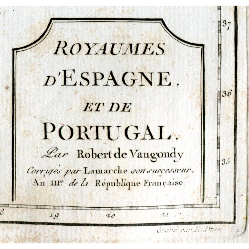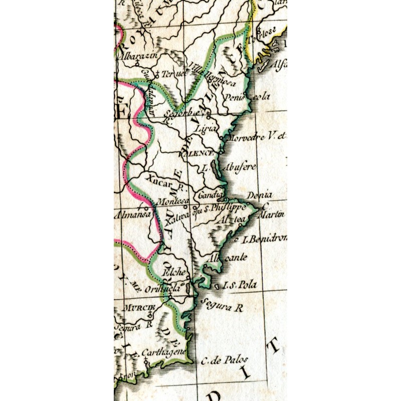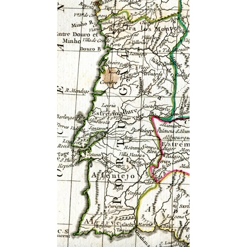 Tamaño de la plancha: 25,3x29,5 cm. Tamaño del papel: 31,8x45 cm. Estado: Manchas de óxido que se aprecian en la imagen. Gilles Robert de Vaugondy (1688-1766) y su hijo, Didier Robert de Vaugondy (1723-1786), formaron uno de los talleres de fabricación de mapas y globos terráqueos más destacados y reconocidos de Francia a mediados del siglo XVIII. Eran descendientes de uno de los cartógrafos más importantes del siglo anterior, Nicolas Sanson a través de su nieto Pierre Moulard-Sanson, de quien en 1730 heredaron la mayor parte del material cartográfico que la dinastía Sanson había acumulado durante casi un siglo de trabajo, material que completaron con el adquirido de los descendientes de Hubert Jaillot. Con ellos formaron la base con la que iniciar su obra más ambiciosa y conocida, el Atlas Universel (1757), uno de los más bellos atlas producidos por la escuela francesa a mediados de siglo. Para ello, los Vaugondy, que contaban con una excelente formación geográfica, integraron la información obtenida de la revisión de los materiales heredados más antiguos con los mapas más actualizados del momento, incluyendo nuevos topónimos, las últimas investigaciones académicas, los diarios de los exploradores y misioneros contemporáneos. e incluso observación astronómica, a veces comprobando y corrigiendo la latitud y longitud de muchos mapas a partir de sus propias observaciones. Además, a diferencia de muchos cartógrafos de la época, se esforzaron en indicar las fuentes que utilizaron para elaborarlos, al igual que hicieron en su momento cartógrafos tan destacados como Ortelius o Mercator. Ambos trabajaron juntos y, en ocasiones, no es posible atribuir sus mapas al padre o al hijo, ya que muchas veces firmaban con el apellido, sin las iniciales, aunque en otros casos la autoría puede determinarse por la forma distintiva de cada uno. : el padre normalmente usa "M. Robert" y el hijo "Robert de Vaugondy". Ambos recibieron el título honorífico de Geographe ordinaire du Roy, el padre en 1730 y Didier en 1760. A la muerte del hijo, el taller cartográfico pasó a Jean Fortin monos, en 1778, y más tarde a Charles Francis Delamarche.