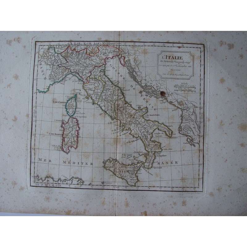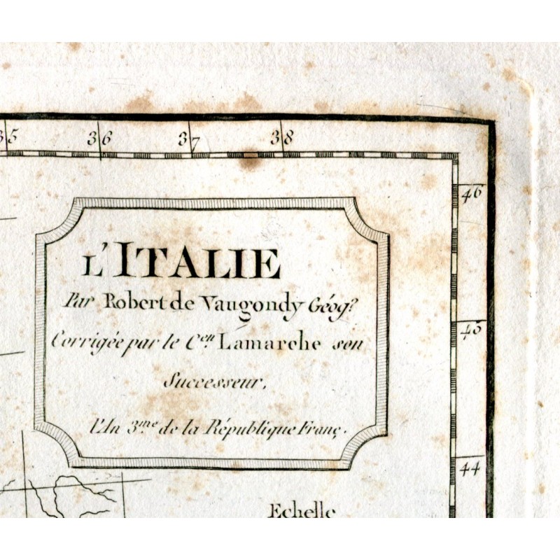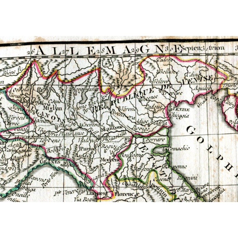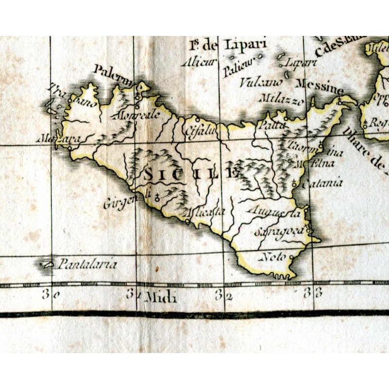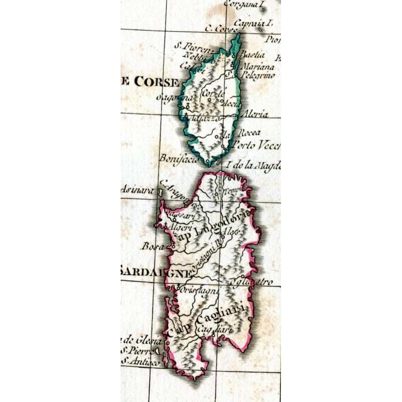 Tamaño plato: 25,8x30 cm. Tamaño del papel: 31,8x45 cm. Estado: Manchas de óxido que se aprecian en la imagen. Gilles Robert de Vaugondy (1688-1766) y su hijo, Didier Robert de Vaugondy (1723-1786), formaron uno de los talleres de fabricación de mapas y globos terráqueos más destacados y reconocidos de Francia a mediados del siglo XVIII. Eran descendientes de uno de los cartógrafos más importantes del siglo anterior, Nicolas Sanson a través de su nieto Pierre Moulard-Sanson, de quien en 1730 heredaron la mayor parte del material cartográfico que la dinastía Sanson había acumulado durante casi un siglo de trabajo, material que completaron con el adquirido de los descendientes de Hubert Jaillot. Con ellos formaron la base con la que iniciar su obra más ambiciosa y conocida, el Atlas Universel (1757), uno de los más bellos atlas producidos por la escuela francesa a mediados de siglo. Para ello, los Vaugondy, que contaban con una excelente formación geográfica, integraron la información obtenida de la revisión de los materiales heredados más antiguos con los mapas más actualizados del momento, incluyendo nuevos topónimos, las últimas investigaciones académicas, los diarios de los exploradores y misioneros contemporáneos. e incluso observación astronómica, a veces comprobando y corrigiendo la latitud y longitud de muchos mapas a partir de sus propias observaciones. Además, a diferencia de muchos cartógrafos de la época, se esforzaron en indicar las fuentes que utilizaron para elaborarlos, al igual que hicieron en su momento cartógrafos tan destacados como Ortelius o Mercator. Ambos trabajaron juntos y, en ocasiones, no es posible atribuir sus mapas al padre o al hijo, ya que muchas veces firmaban con el apellido, sin las iniciales, aunque en otros casos la autoría puede determinarse por la forma distintiva de cada uno. : el padre normalmente usa "M. Robert" y el hijo "Robert de Vaugondy". Ambos recibieron el título honorífico de Geographe ordinaire du Roy, el padre en 1730 y Didier en 1760. A la muerte del hijo, el taller cartográfico pasó a Jean Fortin monos, en 1778, y más tarde a Charles Francis Delamarche.