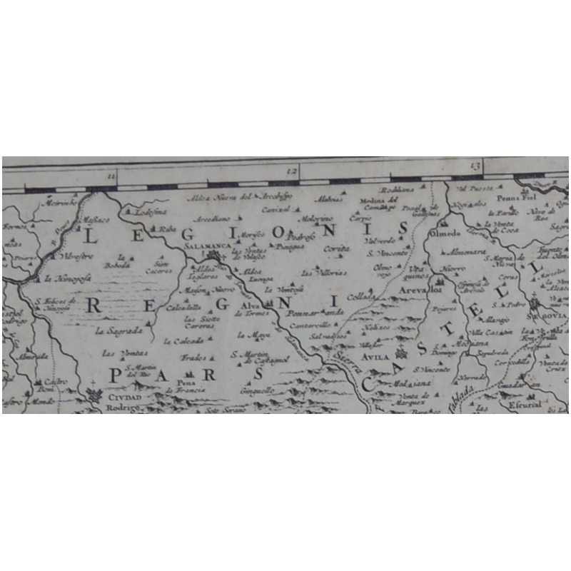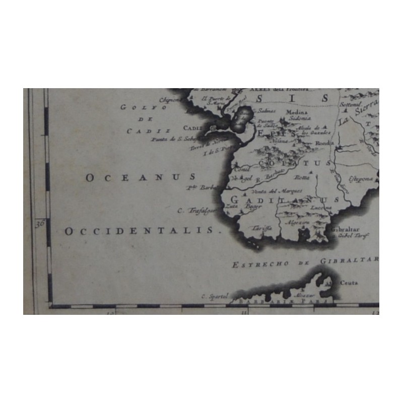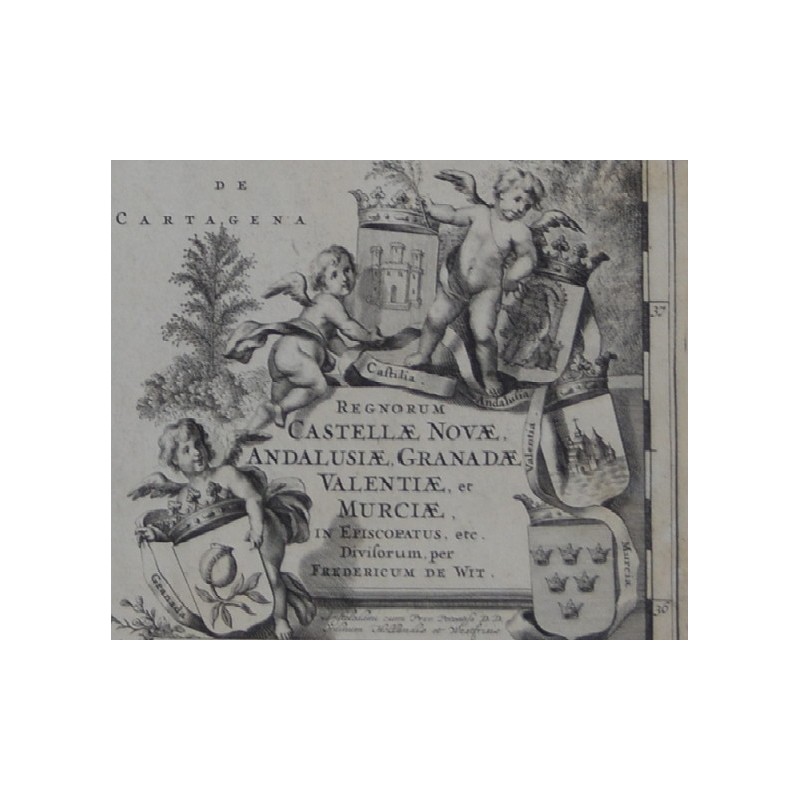 Interesante grabado de Castilla, Andalucia, Valencia y Murcia. En la cartela de abajo a la derecha hay cuatro puttis. Frederick de Wit nació en 1630 fue un famoso grabador en Ámsterdam. Sus mapas se hicieron muy populares por la calidad de sus grabados. Medidas: 52x60 cms.