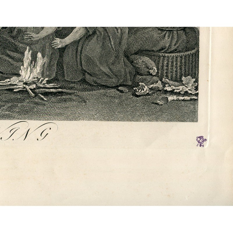 En 'Morning', una señora se dirige a la iglesia, protegiéndose con su abanico de la impactante vista de dos hombres manoseando a las chicas del mercado. La escena es el lado oeste de la plaza de Covent Garden, indicado por una parte del pórtico palladiano de la Iglesia de San Pablo de Inigo Jones visible detrás de Tom King's Coffee House, un lugar notorio celebrado en folletos de la época. La impresión tiene un trozo de cinta en la parte posterior para reparar un rasguño. Falta un pequeño trozo de papel en las esquinas inferior izquierda y superior izquierda. Los bordes tienen leves arañazos. La imagen no se ve afectada. Tamaño de la plancha: 48x40,3 cm. Four Times of the Day es una serie de cuatro pinturas al óleo del artista inglés William Hogarth. Se completaron en 1736 y en 1738 se reprodujeron y publicaron como una serie de cuatro grabados. Son representaciones humorísticas de la vida en las calles de Londres, los caprichos de la moda y las interacciones entre ricos y pobres. Se pueden encontrar más artículos en nuestra tienda en el sitio: //https://www.rubylane.com/item /2211649