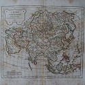 La impresión de la plancha de cobre muestra el hallazgo de las exploraciones de Cook, Perouse, Vancouver y Mackensie en 1801 y 1802. Las líneas costeras de América del Norte y las islas del Pacífico son razonablemente precisas. "Terres Arctiques" no está bien definido. Este es un mapa antiguo muy interesante. Coloreado a mano en el contorno y un solo...