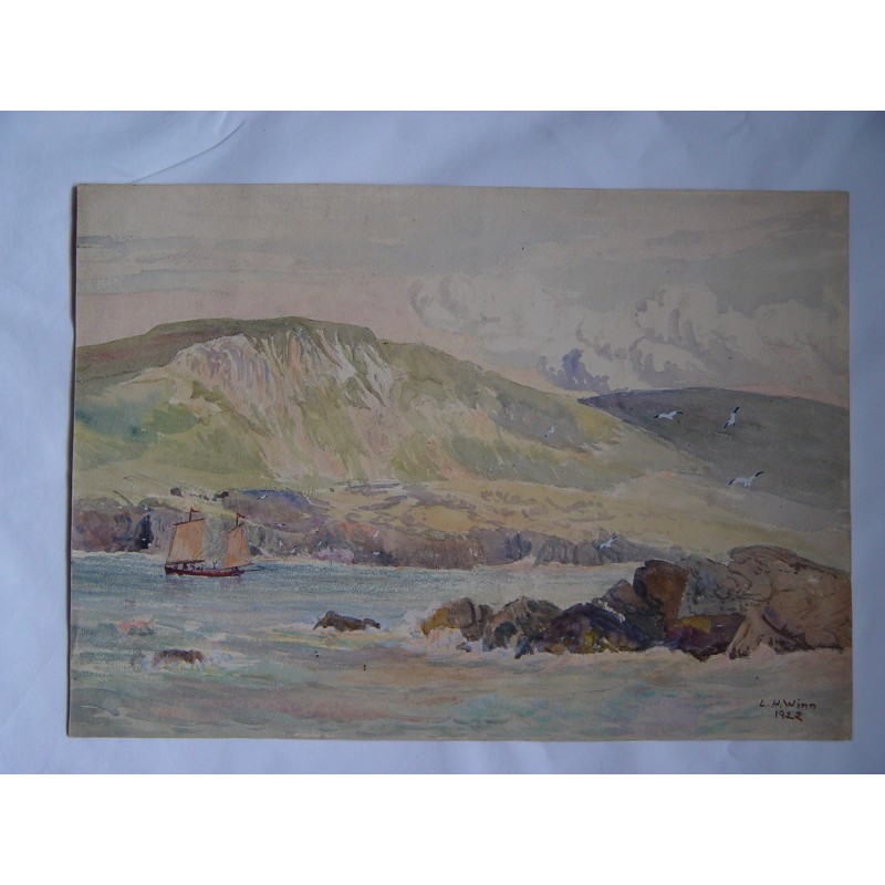 Escena de costa L.H. Winn. Fechada en 1922. Acuarela inglesa del siglo XIX-XX.