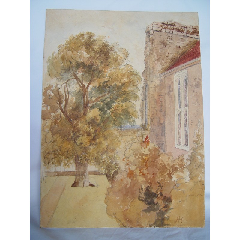 Casa con jardín. Acuarela de la escuela inglesa del siglo XIX-XX. Firmada iniciales.