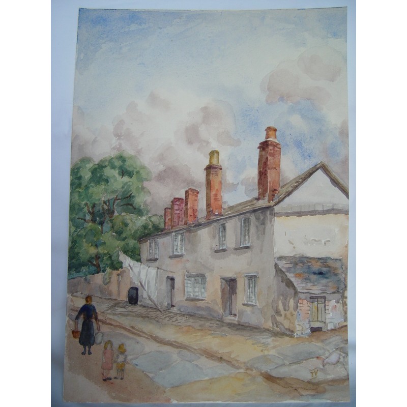 Caserio con figuras Acuarela inglesa del siglo XIX-XX.