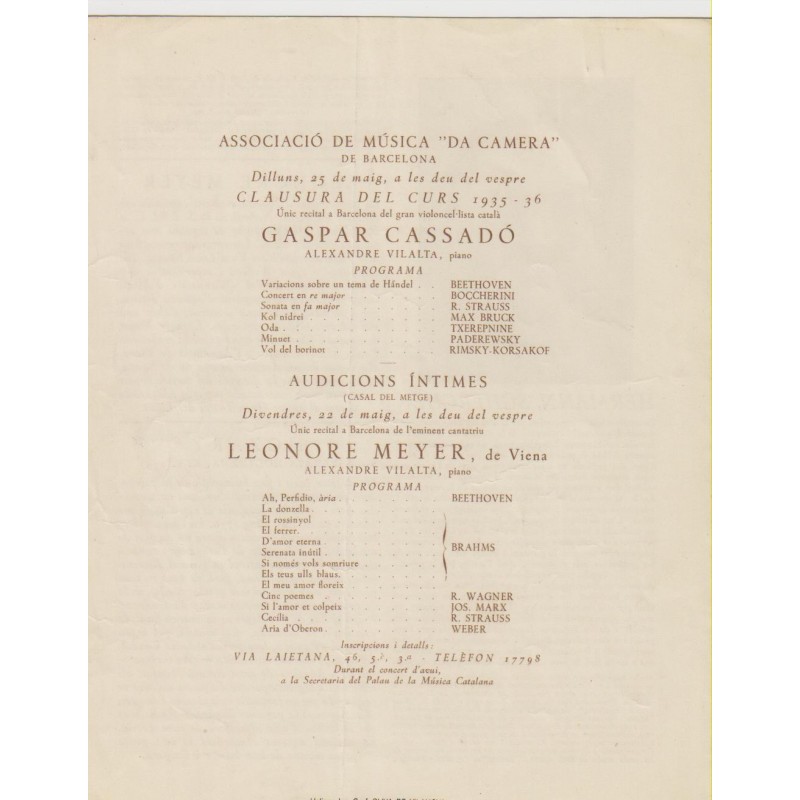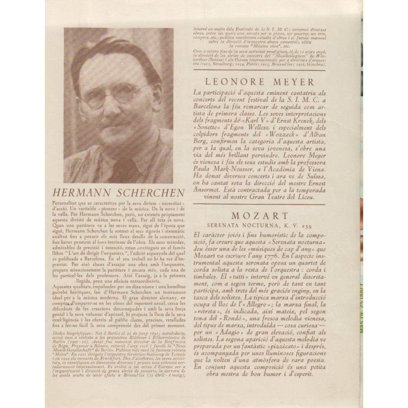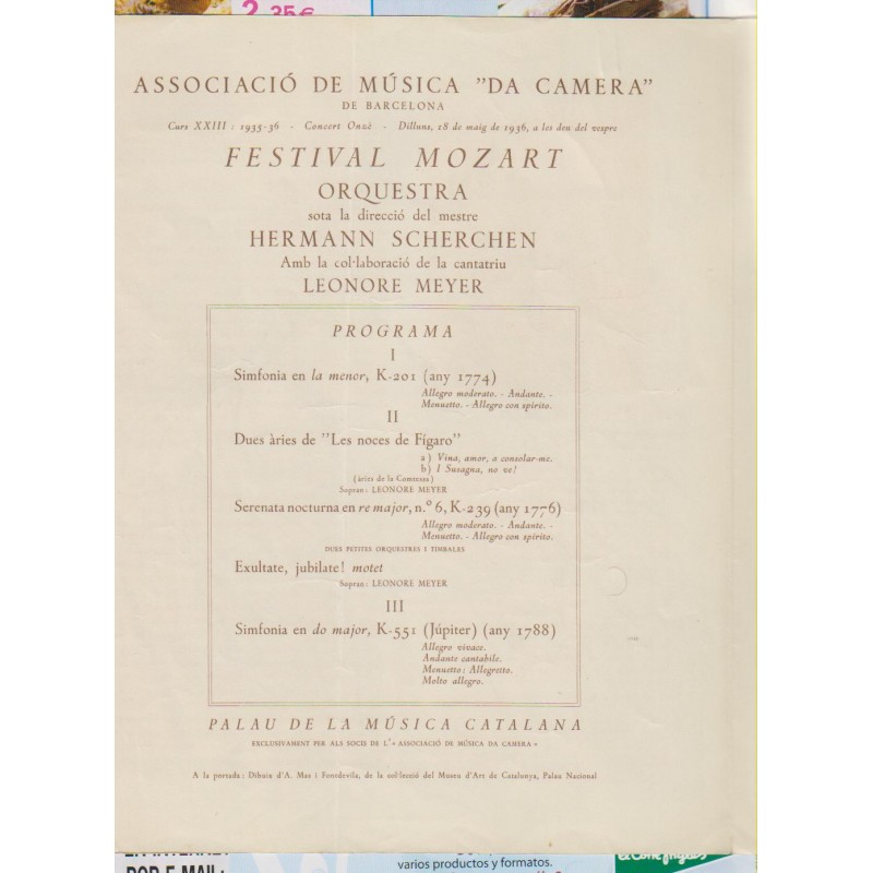 Festival de Mozart de 1936 en la Associació de Música da Camara bajo la dirección de Hermann Schercher y la colaboración de la cantante Leonore Meyer. En la portada ilustración de Más y Fondevilla. Medidas 22,5x18,5 cms.