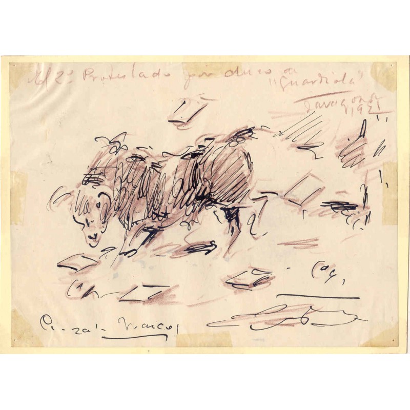 Dibujo del 2º Protestado por duro de Guardiola en Zaragoza, 1921 por el excelente pintor taurino Angel Gonzalez Marcos (1900-1978) nacido en Madrid, discípulo de Roberto Domingo. Medidas:15,7x22,2 cms. Dibujo sobre papel pegado a otro papel. Alguna manchas en los lateralesl que se observa en la fotografia.Recipiente :