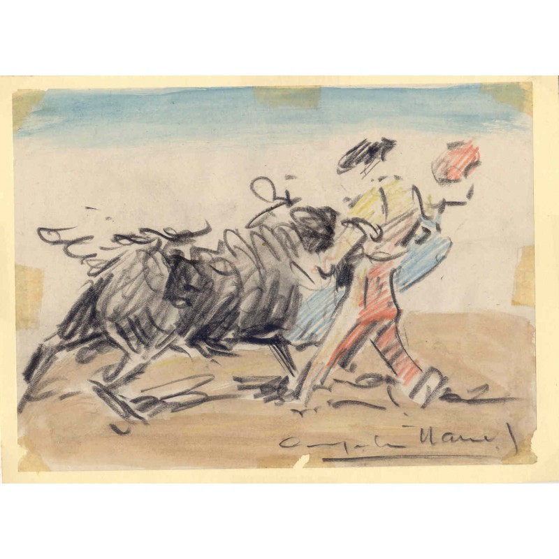 Dibujo por el excelente pintor taurino Angel Gonzalez Marcos (1900-1978) nacido en Madrid, discípulo de Roberto Domingo. Medidas:15,7x21,8 cms. Dibujo sobre papel pegado a otro papel. Manchas en los laterales. Se observan en la fotografia.Recipiente :