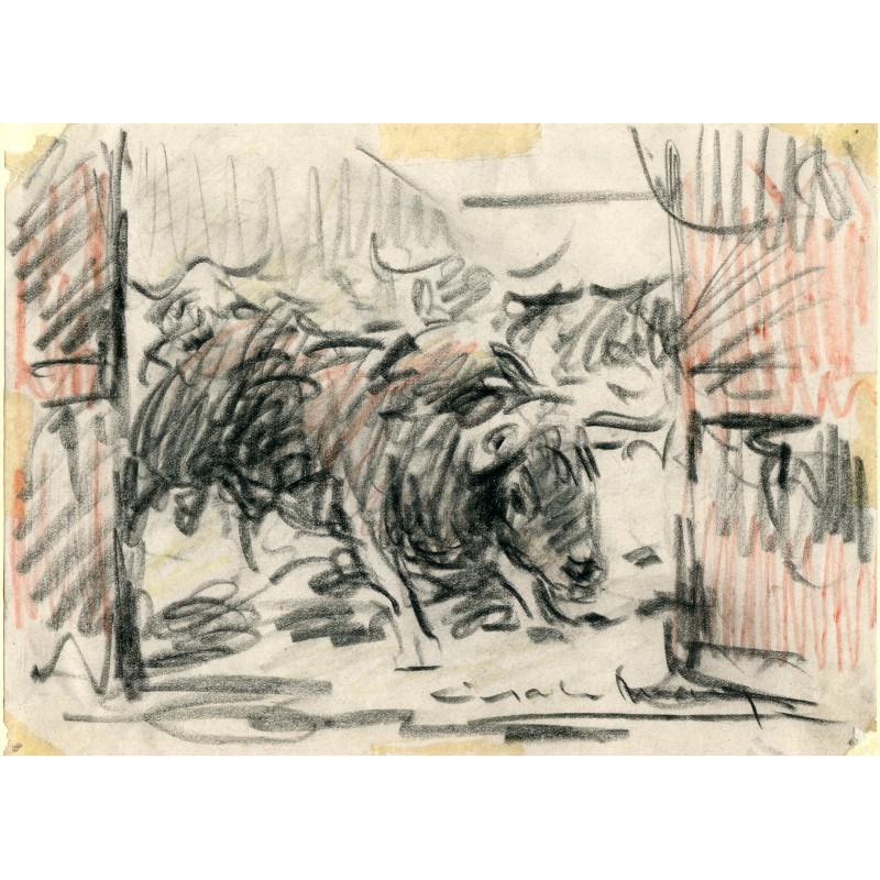 Dibujo por el excelente pintor taurino Angel Gonzalez Marcos (1900-1978) nacido en Madrid, discípulo de Roberto Domingo. Medidas:15,7x21,8 cms. Dibujo pegado a cartulina. Tiene alguna mancha del adhesivo y falta dos trocitos de papel en dos esquinitas como se aprecia en la fotografía.Recipiente :