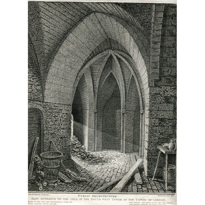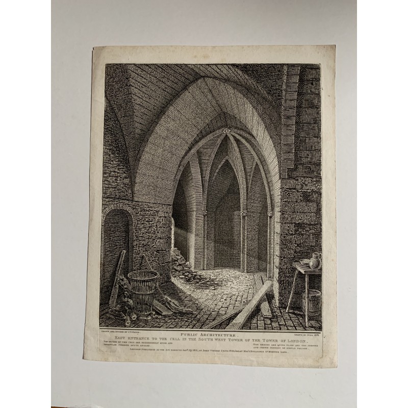 Título: Entrada Este a la celda en la Torre Sur Oeste de la Torre de Londres. Artista y grabador: John Thomas Smith, también conocido como Antiquity Smith (británico, 17661833). Dibujado en 1802 y publicado en 1811. Ilustración de la "Topografía antigua de Londres" de Smith. Tamaño: 30,5x23 cms. Estado: bien.Recipiente :