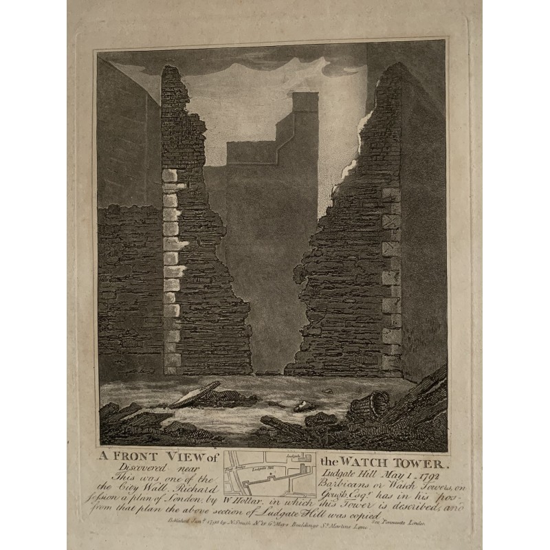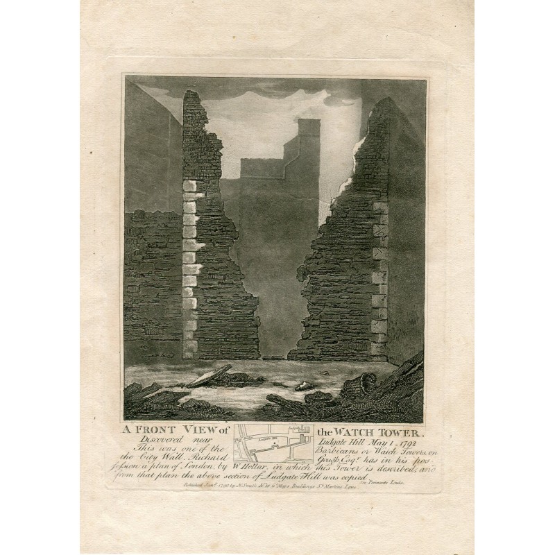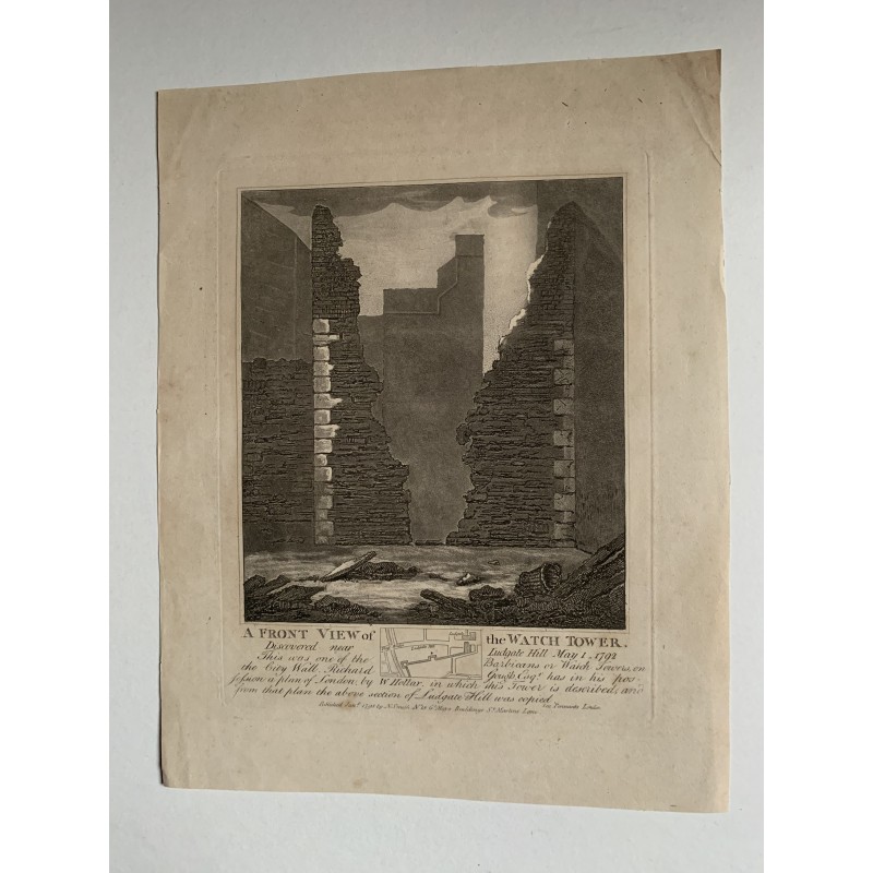 Título: Vista frontal de la Watch Tower o Barbican en la muralla de la ciudad cerca de Ludgate Hill, el 1 de mayo de 1792. Descripción: Grabado en cobre de John Thomas Smith a partir de dibujos originales de miembros de la Sociedad de Antigüedades de su JT Smith's Antiquities of London and its Entornos, J. Sewell, R. Carpeta, J. Simco, Londres, 1793. Medidas: 22,5x18 cms. Estado: en buen estado.Recipiente :