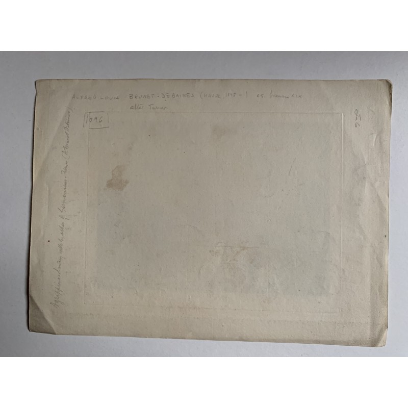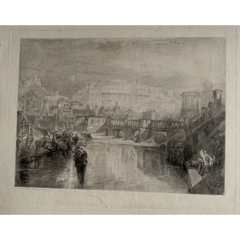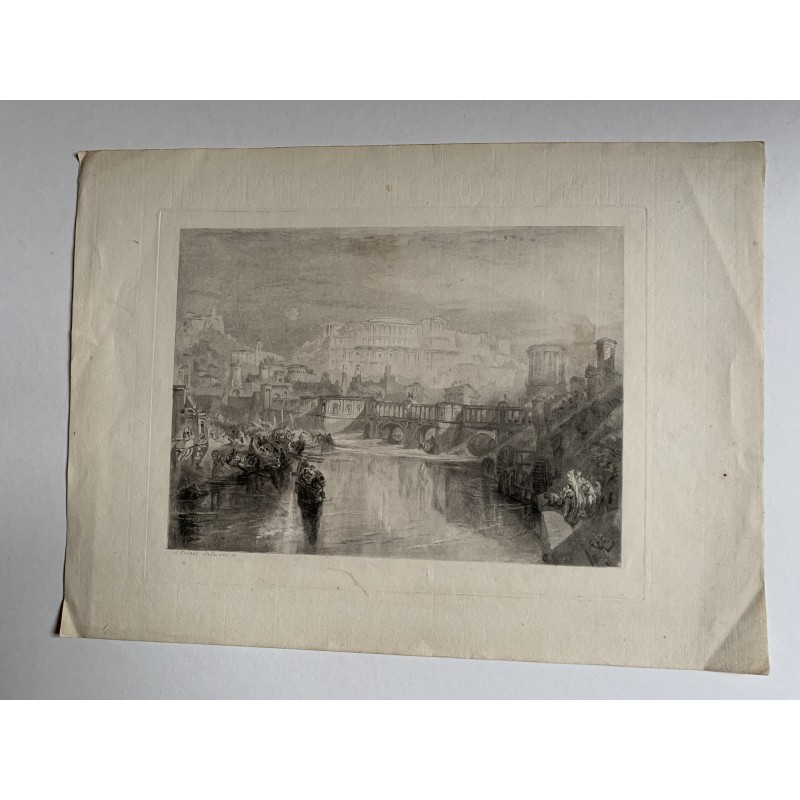 Vista del Tíber con Puente Triunfal. Artista: a partir de obra de Joseph Mallord William Turner (1775-1851). Grabador: Alfred Louis Brunet-Debaines (francés, 1845 - 1939). Publicado por: Seeley&Co, Londres. Técnica: aguafuerte y aguatinta. Tamaño: 20x24,5 cms. Estado: bueno.Recipiente :
