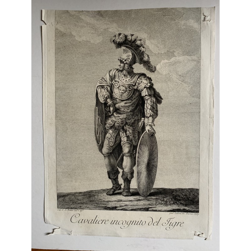 Título: Cavaliere incognito del Tigre Artista: E Alexandre Petitot (1727-1801) Grabador: Giuliano Zuliani (c.1730-c.1814) Editorial: Publicado por Parma - Stamperia Reale Procedencia:Descrizione delle feste celebre in Parma l'anno 1769 Producción fecha: 1769 Tamaño imagen: 33x24 cm Tamaño hoja: 38x28,4 cm Estado: Recortado en margen superior. Falta una parte de la esquina que no afecta la imagenRecipiente :