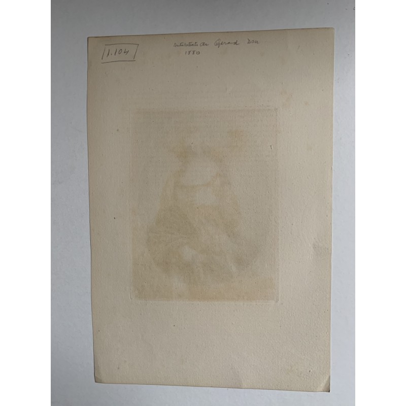 Artista: a partir de obra de Gerard Dou (aka Gerrit Dou; Gerard Dow) (1613-1675). Grabador: Paul-Adolphe Rajon (1843 1888) Medios/Técnica: Aguafuerte sobre papel verjurado crema con márgenes generosos y respaldado con una hoja de soporte. Fecha de producción: c.1863-c.1888. Tamaño: 18,6x14,2 cms. Estado: bien.Recipiente :