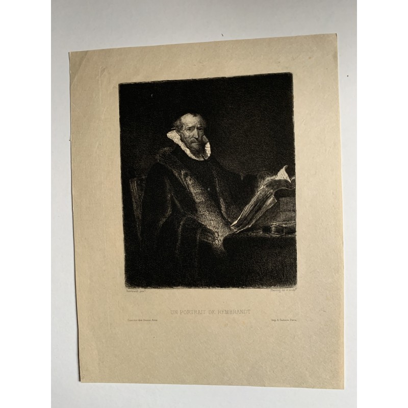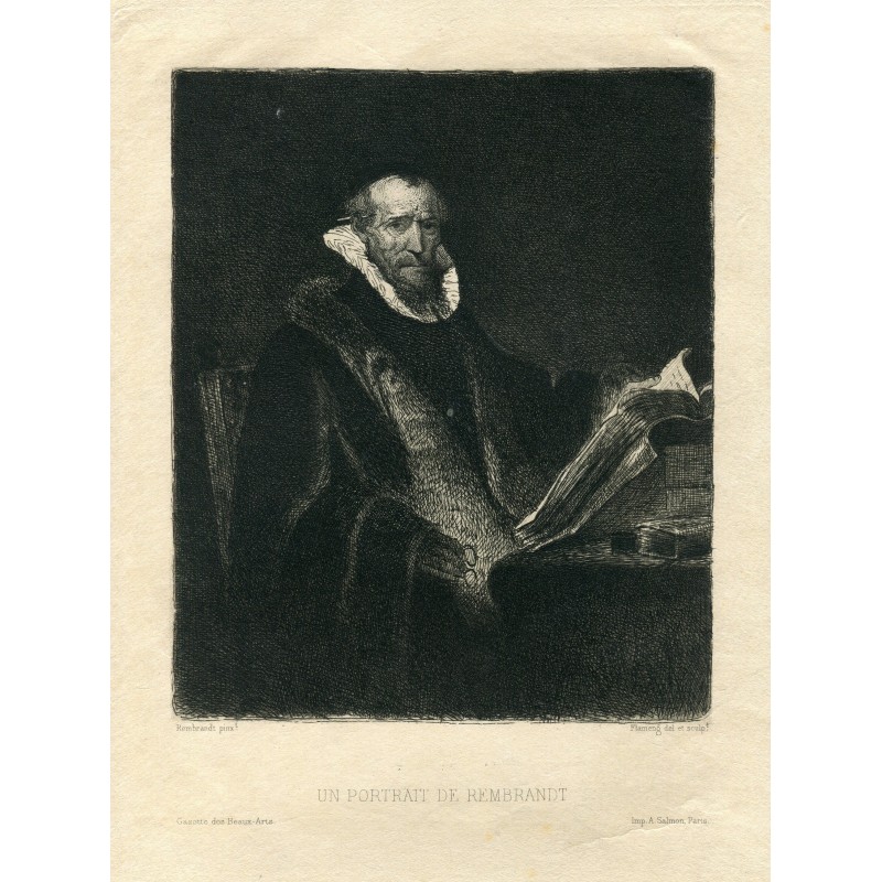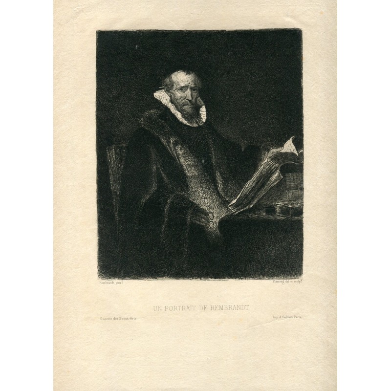 Título: Un retrato de Rembrandt. Artista: a partir de obra de Rembrandt (Rembrandt van Rijn) (Holandés, Leiden 1606-1669 Amsterdam). Grabador: Léopold Flameng (francés (nacido en Bélgica), Bruselas 1831-1911 París). media: aguafuerte y grabado. Procedencia: Gazette des Beaux-Arts. Editorial: Salmón, en París. Fecha de producción: 1864. Estado: bien.Recipiente :
