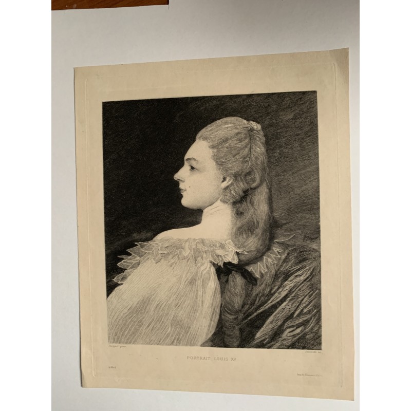 Título: Retrato Luis XV Artista: a partir de obra de Gustave Jean Jacquet (francés, 1846 - 1909) Grabador: Felix Jasinski (1862-1901) . Descripción: grabado en acero antiguo con una mujer joven en vestido Luis XV Fecha de producción: c.1888. Editado por: Clement para L´Art en París. Medio: aguafuerte Tamaño de la plancha: 30,5x24,8 cms. Estado: bueno.Recipiente :