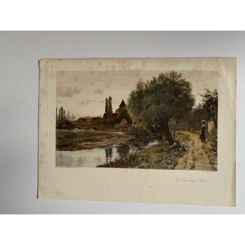 Título: La hora de la tarde. Artista: a partir de obra de Ernest Albert Waterlow (británico, 1850 - 1919) Grabador: J Dobie (británico, 1849 - c.1911). Fecha de producción: 1906. Descripción:grabado coloreado a mano. Con sello seco en el ángulo inferior derecho. plancha marca: 21,5x28 cms. Estado:algo de manchas sobre todo en los márgenes y la parte superior. Afecta la parte del cielo de la imagenRecipiente :