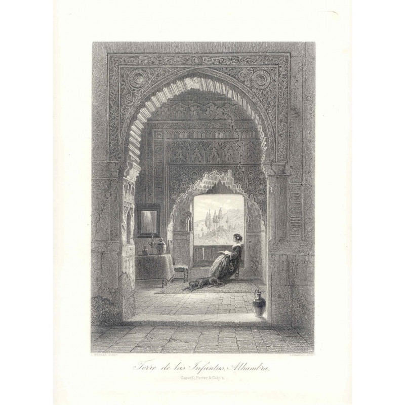 Título: Torre de las Infantas. Alhambra. (Granada - España) Artista: Carl Friedrich Heinrich Werner (4 de octubre de 1808 10 de enero de 1894) Grabador: T Heawood (británico, siglo XIX) Tamaño de la plancha: 27 x 19,5 cms. Estado: algo de manchas en los márgenes. En buena condición.Recipiente :
