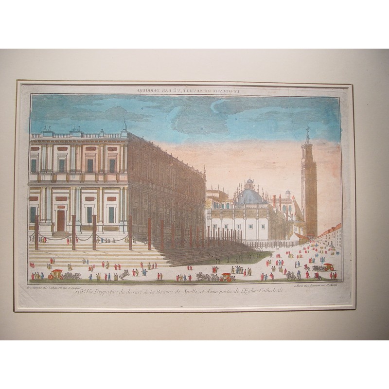 Grabado original de la escuela francesa del siglo XVIII, coloreado a mano. Medidas de la huella 27 x 40,5 cms. Buena conservación.Recipiente :