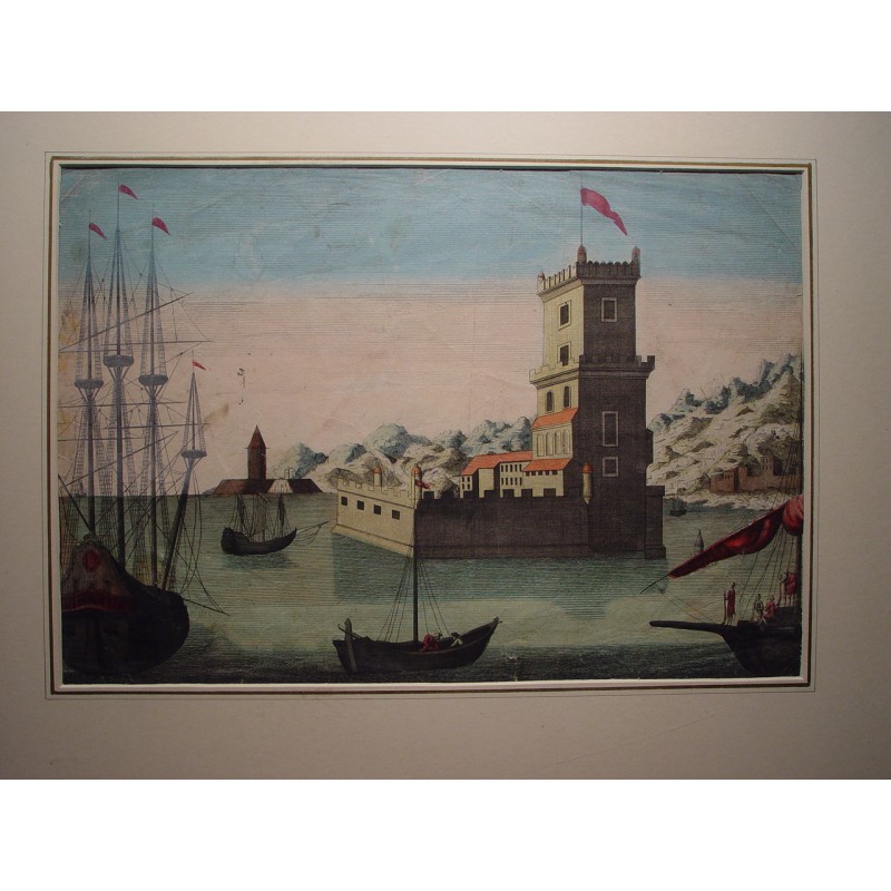 Grabado de la escuela francesa del siglo XVIII, coloreado a mano. Medidas de la imagen 27,5 x 40 cms. Ligeros deterioros poco perceptibles.Recipiente :