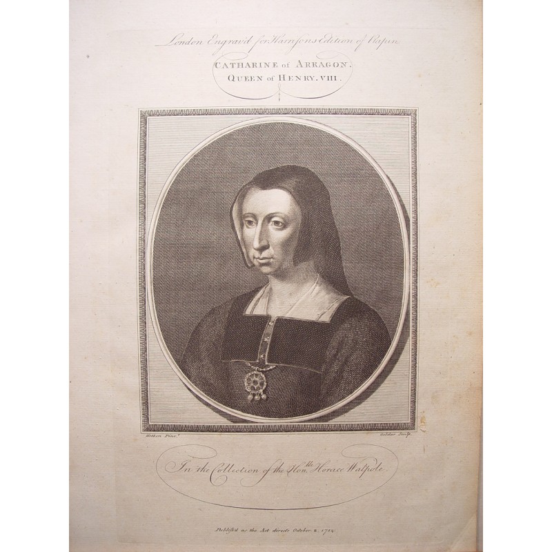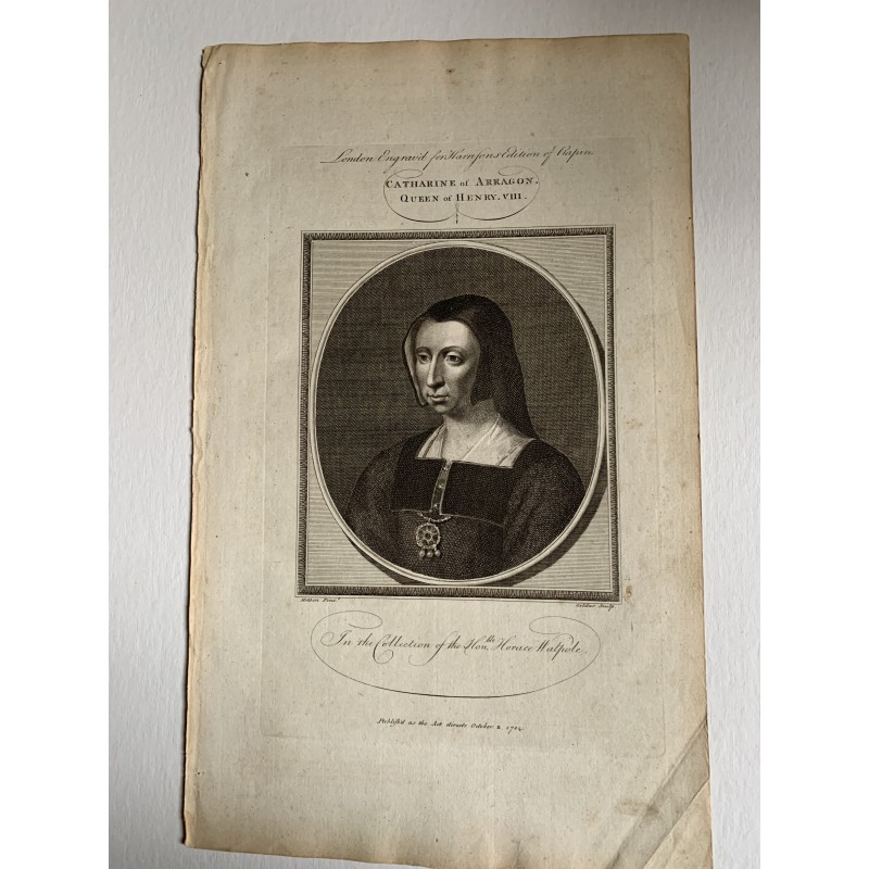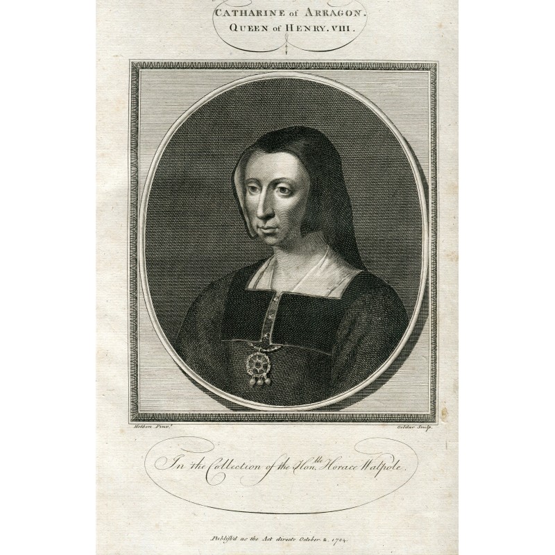 Título: Catalina de Aragón, reina de Enrique VIII. Artista: a partir de obra de una obra de Hans Holbein. Grabador: John Goldar (británico, 1729-1795). plancha marca: 31 x 20 cms. Fecha: 1784. Inscripción: En la colección del Honorable Horace Walpole. Estado: algo desgastado por los años que se aprecia en la imagen.Recipiente :