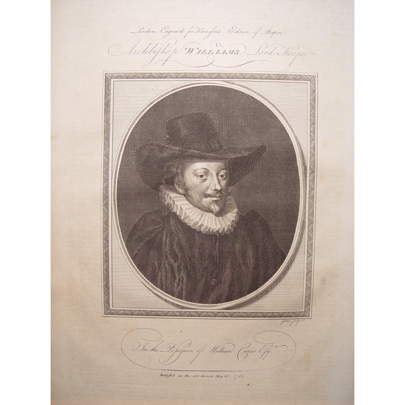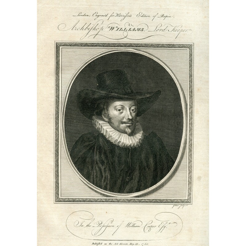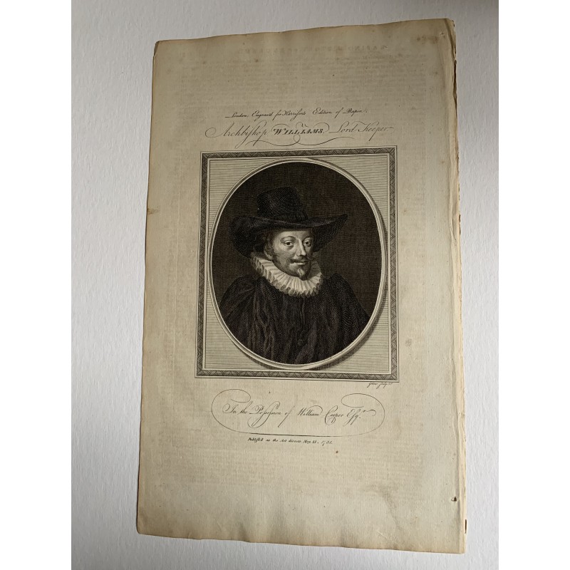 Título: Arzobispo Williams, Lord Keeper. Grabador: Jabez Goldar (británico, 1729-1795). El primer nombre de Goldar no era John sino Jabez. Fecha: 1783. Inscripción: En la Pofsefsion de William Cooper Efgr. plancha marca: 18,5 x 20 cms. Estado: algo desgastado por los años que se aprecia en la imagen.Recipiente :