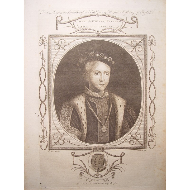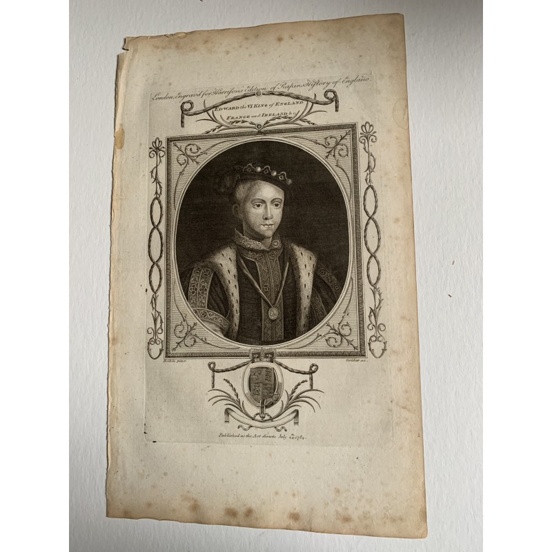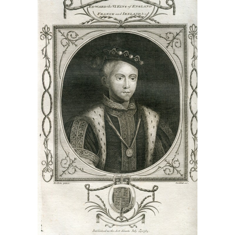 Título: Eduardo VI. Rey de Inglaterra y Francia e Irlanda. Grabador: Jabez Goldar (británico, 1729-1795). El primer nombre de Goldar no era John sino Jabez. Artista: a partir de obra de una obra de Hans Holbein (c.1497-1543). Fecha: 1784. plancha marca: 30,5x20 cms. Estado: algo desgastado por los años principalmente en los márgenes que se aprecian en la imagen.Recipiente :