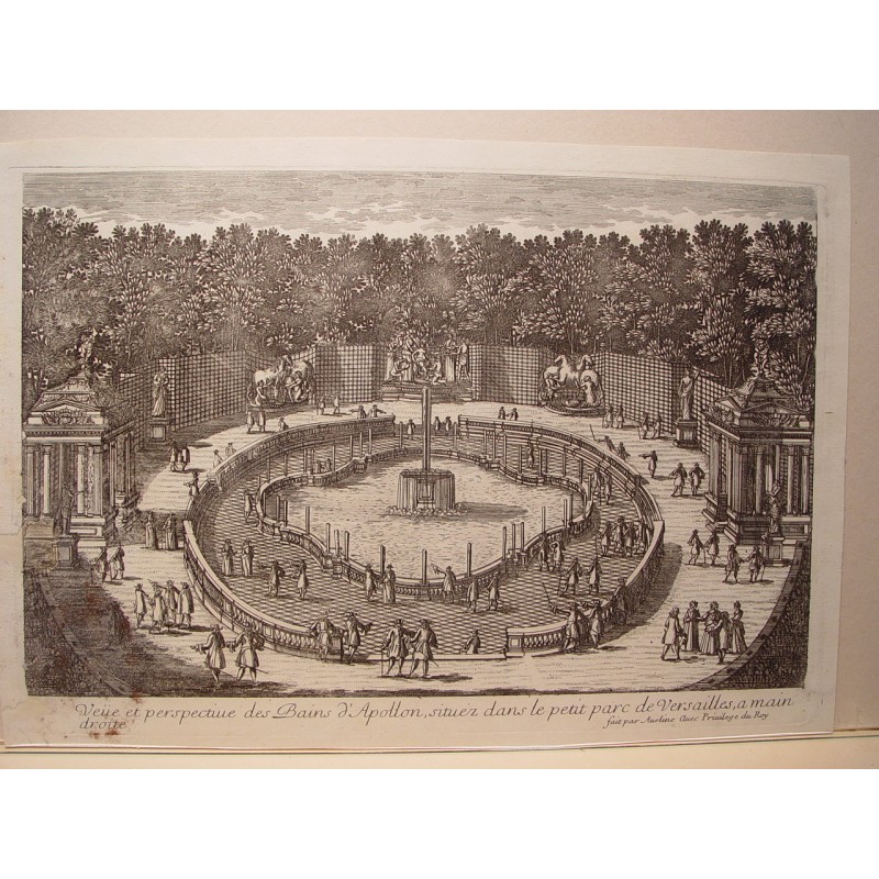 Veue des Bains d´Apollon, situez dans le petit parc de Versailles, a main droite. Dib..y grabó Pierre Aveline (París,1656-1722)