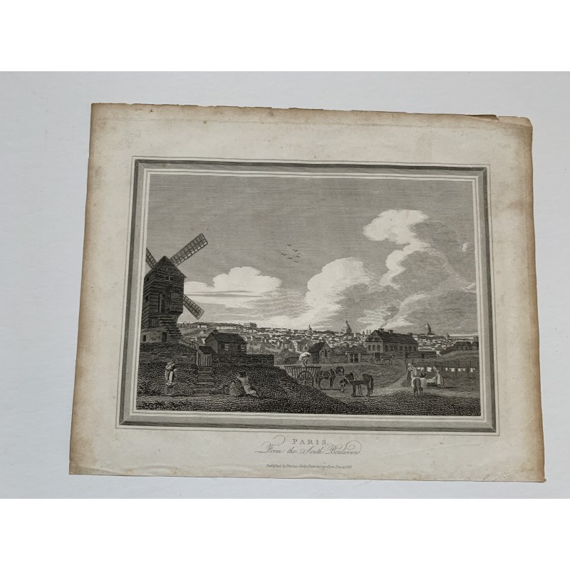 Del Bulevar Sur. París. Publicado por Thomas Kelly, 1816. Tamaño de la plancha: 20x26 cms. Estado: En buen estado. Algo de manchas como se puede ver en la imagen. Hay algunas manchas o imperfecciones principalmente en los márgenes y por el manejo.Recipiente :