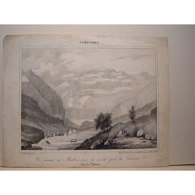 Título: Hautes Pyrénées, Marboré prise du second pont de Gavarnie. Litógrafo: Engelmann (1788-1839). Artista: a partir de obra de Paul Jean Pierre Gelibert (francés, 1802-1882). Soporte/Técnica: Litografía antigua original. Fecha de producción: 1828. Tamaño de la imagen: 17,4x23,2 cms. Estado: bueno.Recipiente :
