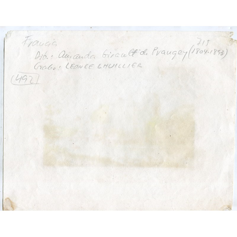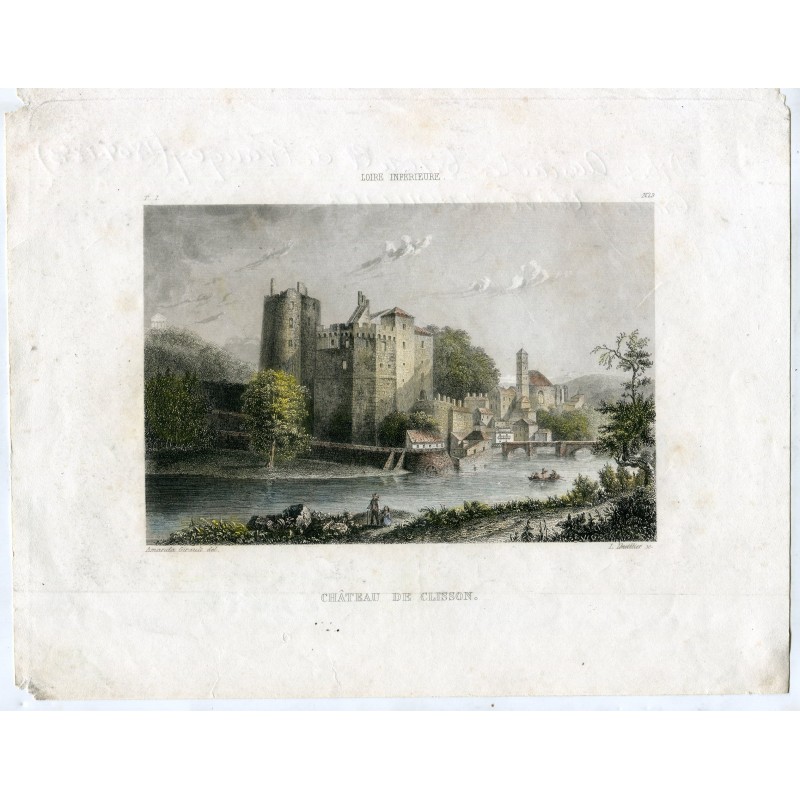 Título: Château de Clisson Grabador: Leonce Lhuillier Artista: según Amanda Girault de Saint Fargeau. Medio/técnica: grabado en acero antiguo coloreado a mano. Fecha de producción: 1851. Tamaño de la imagen: 11x16,5 cms. Estado: algo de manchas. Faltan algunas esquinas.Recipiente :