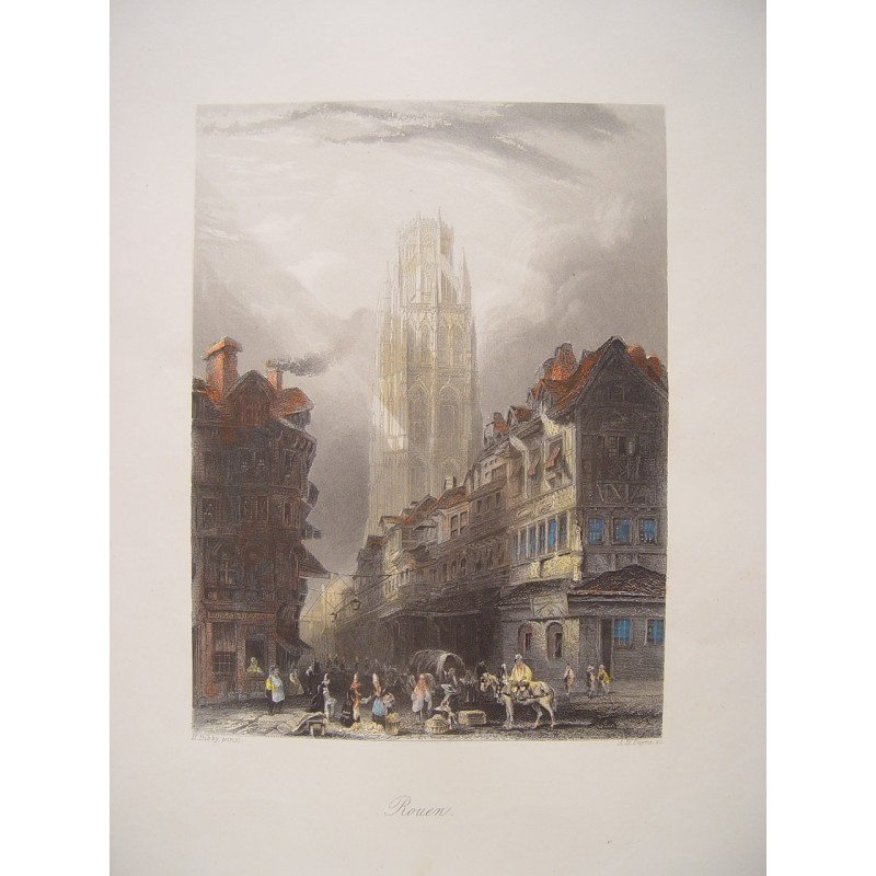 Título: Rouen (Francia). Grabador: Albert Henry Payne (1812-1902). Artista: a partir de obra de H. Bibby (fl. 1840). Descripción: Antiguo grabado en acero coloreado a mano con una escena topográfica de una calle de Rouen, que muestra una calle concurrida en el centro, flanqueada por tiendas, con la torre de la catedral elevándose al fondo. Tamaño de la imagen: 15x11,2 cms Estado: bueno.Recipiente :