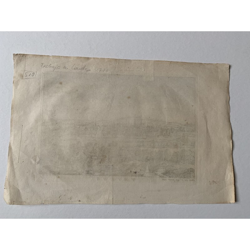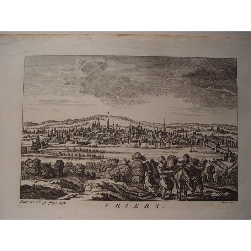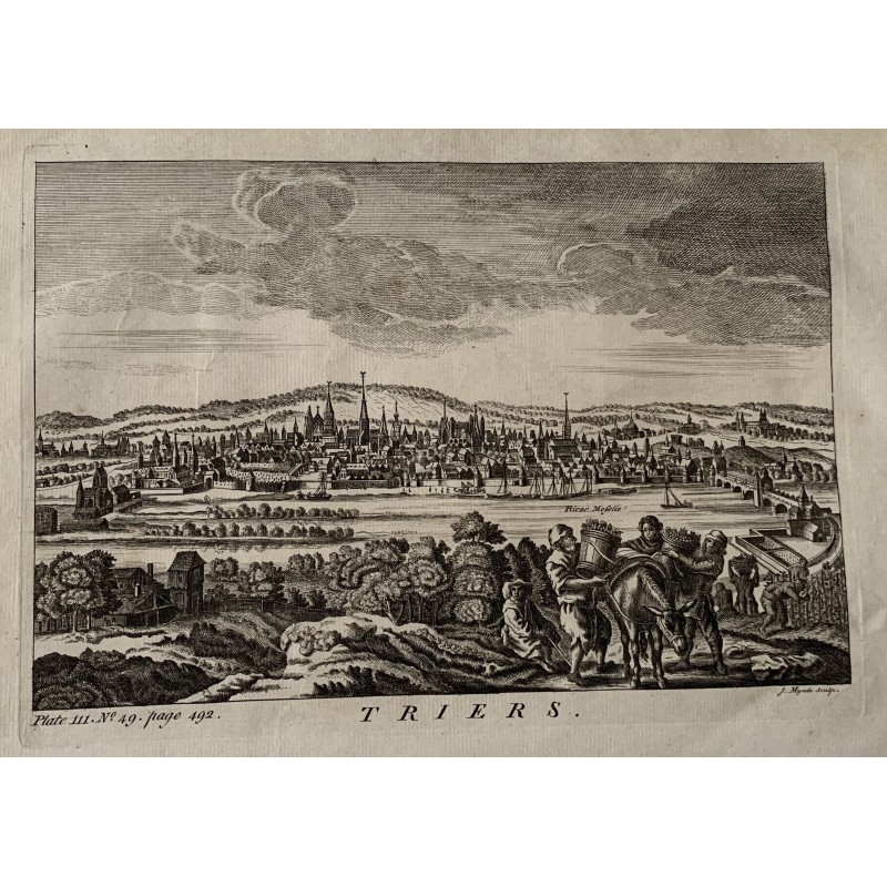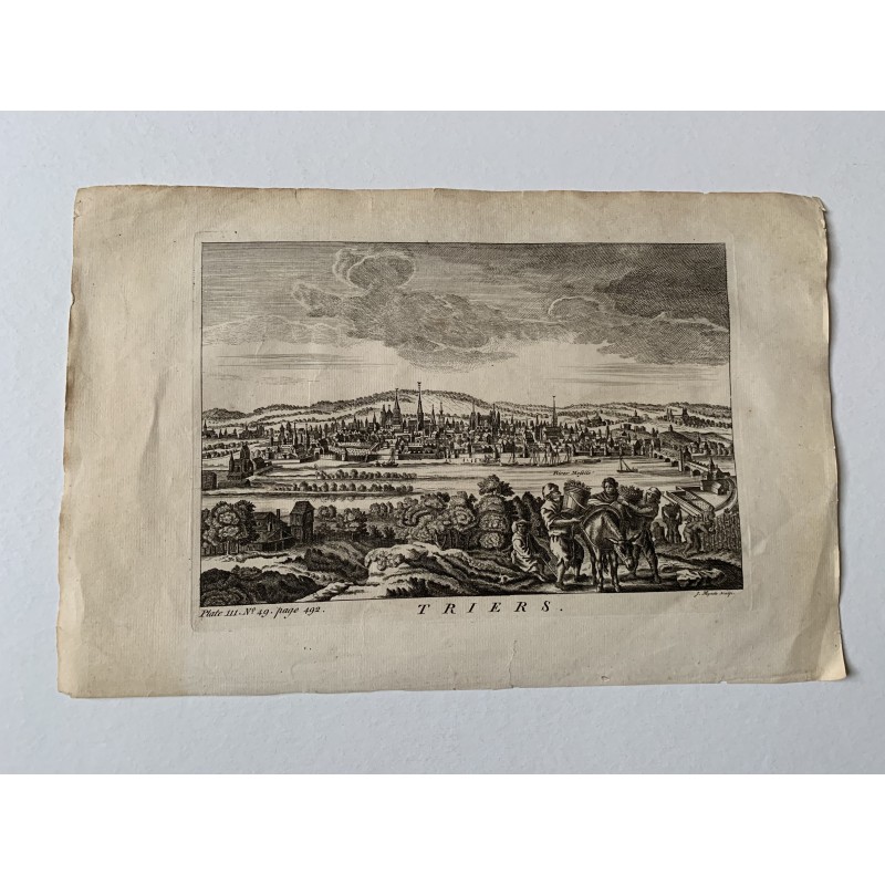 Título: Tréveris. Grabador: James Mynde (1702-1771) plancha marca: 18,5x26 cm. Estado: una restauración con cinta en la parte inferior central que no afecta la imagen. Hay algunas manchas o imperfecciones principalmente en los márgenes y por el manejo. Escanee cuidadosamente.Recipiente :
