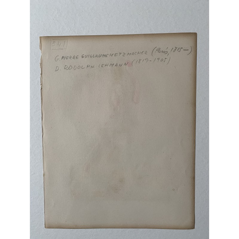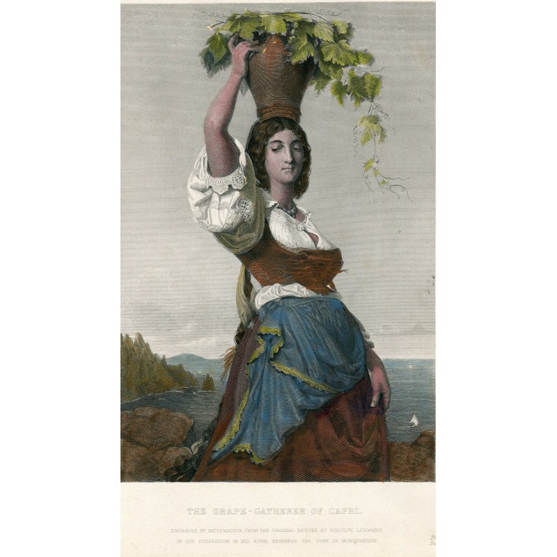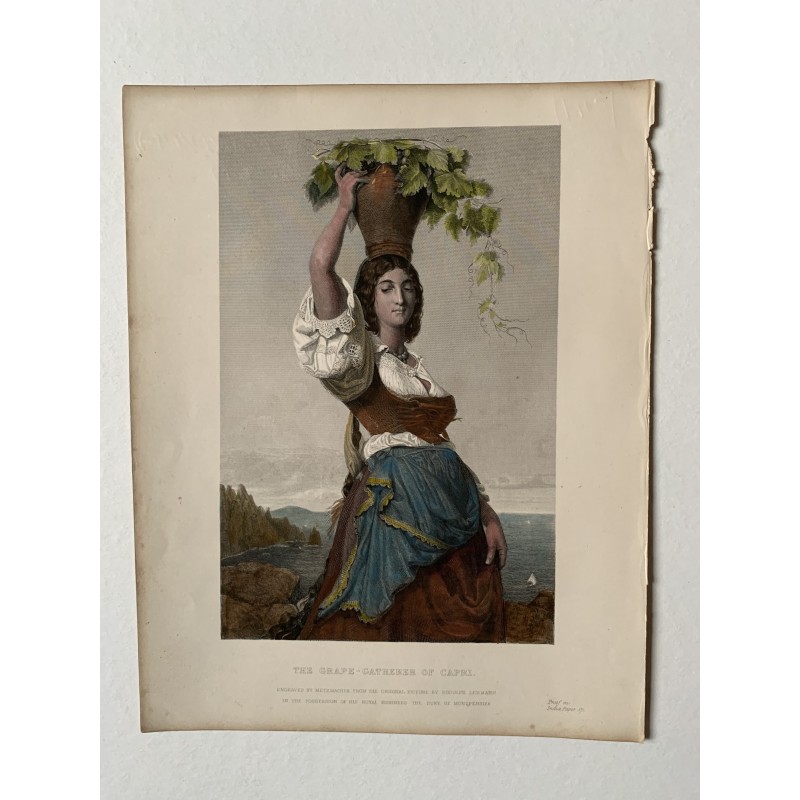 Título: El vendimiador de Capri. Artista: a partir de obra de Rudolf Lehmann (1819-1905). Grabador: Pierre Guillaume Metzmacher (1815-1872 después). Fecha: c.1850. Descripción: Grabado coloreado a mano con una campesina italiana de pie con un jarrón de vides en la cabeza; vista costera detrás. Estado: buen estado.Recipiente :
