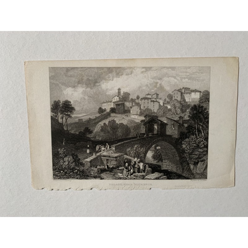 Título: Pegalo, cerca de Florencia. Artista: a partir de obra de James Duffield Harding (1708-1863). Grabador: James Bayle Allen (1803-1876). Fecha de producción: 1832. Tamaño de la imagen: 10,5x14,8 cms. Condición: signos de aspereza a lo largo del borde inferior por haberlo quitado de la encuadernación. La inscripción se ve afectada pero no la imagen.Recipiente :